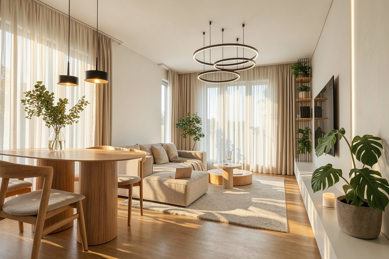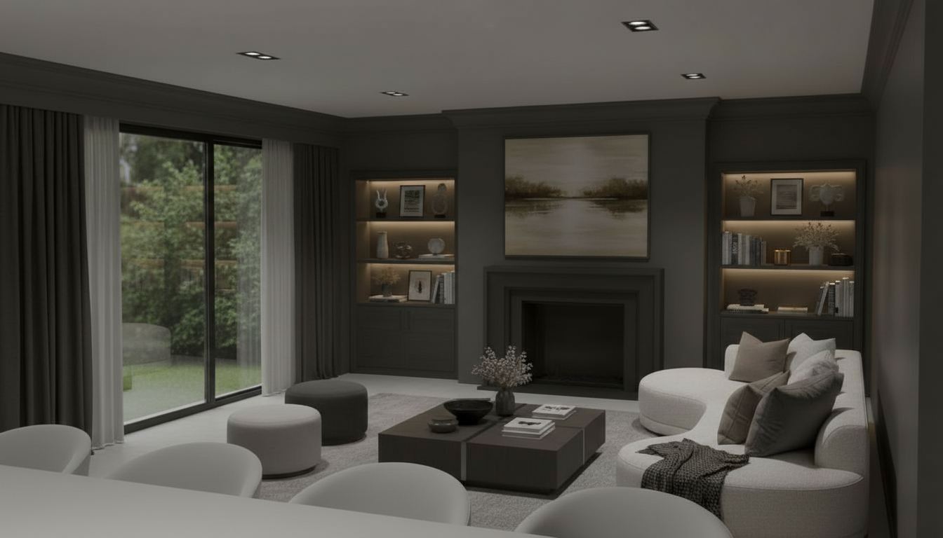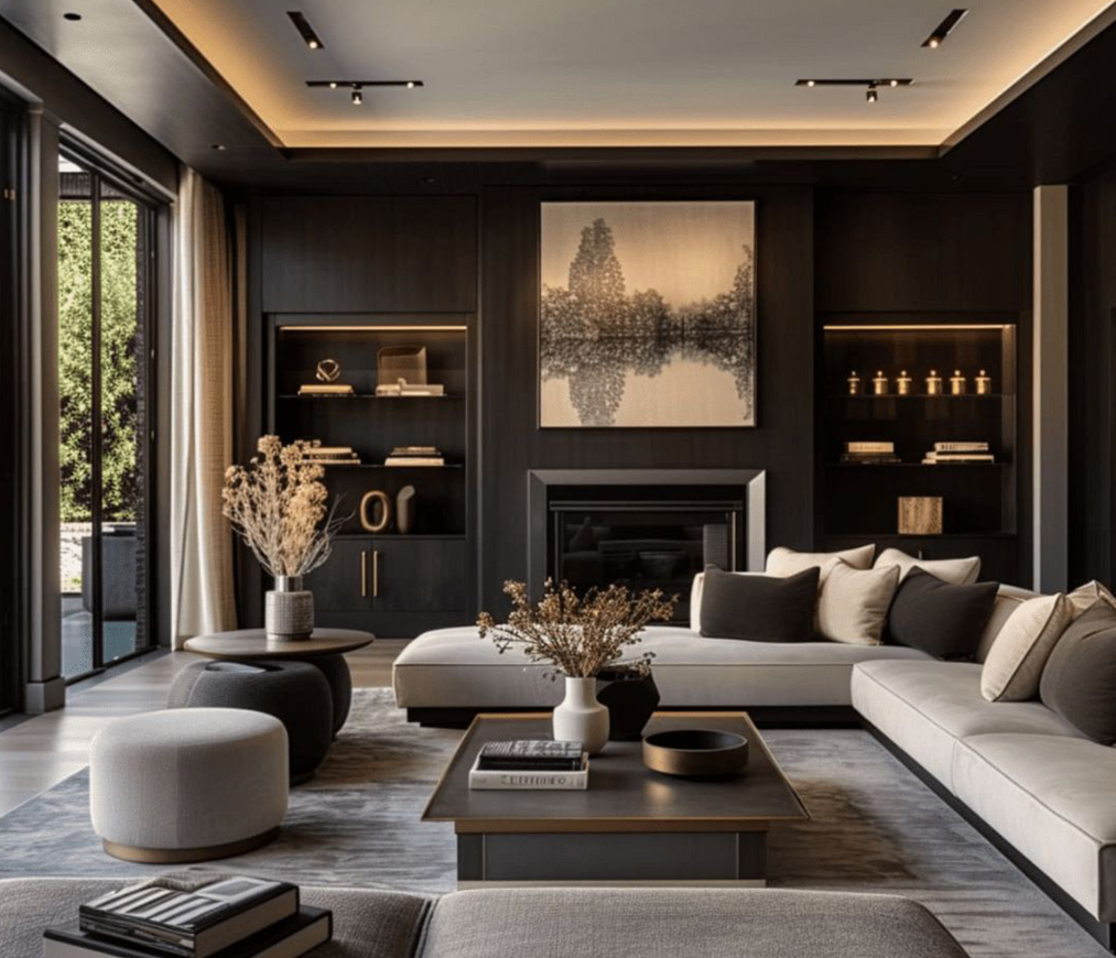 exterior shot a cozy and elegant living room with a warm inviting atmosphere the walls are painted in soft ivory a plush curved velvet sofa in deep navy blue with matching cushions is the centerpiece accented with a luxurious dark gray throw blanket draped over the back the fireplace is crafted from sleek black marble radiating warmth on either side dark mahogany wood bookcases stand neatly arranged with books and decorative pieces a subtle ambient glow from hidden lights creates a serene and relaxing atmosphere while a large window lets in natural light complementing the space