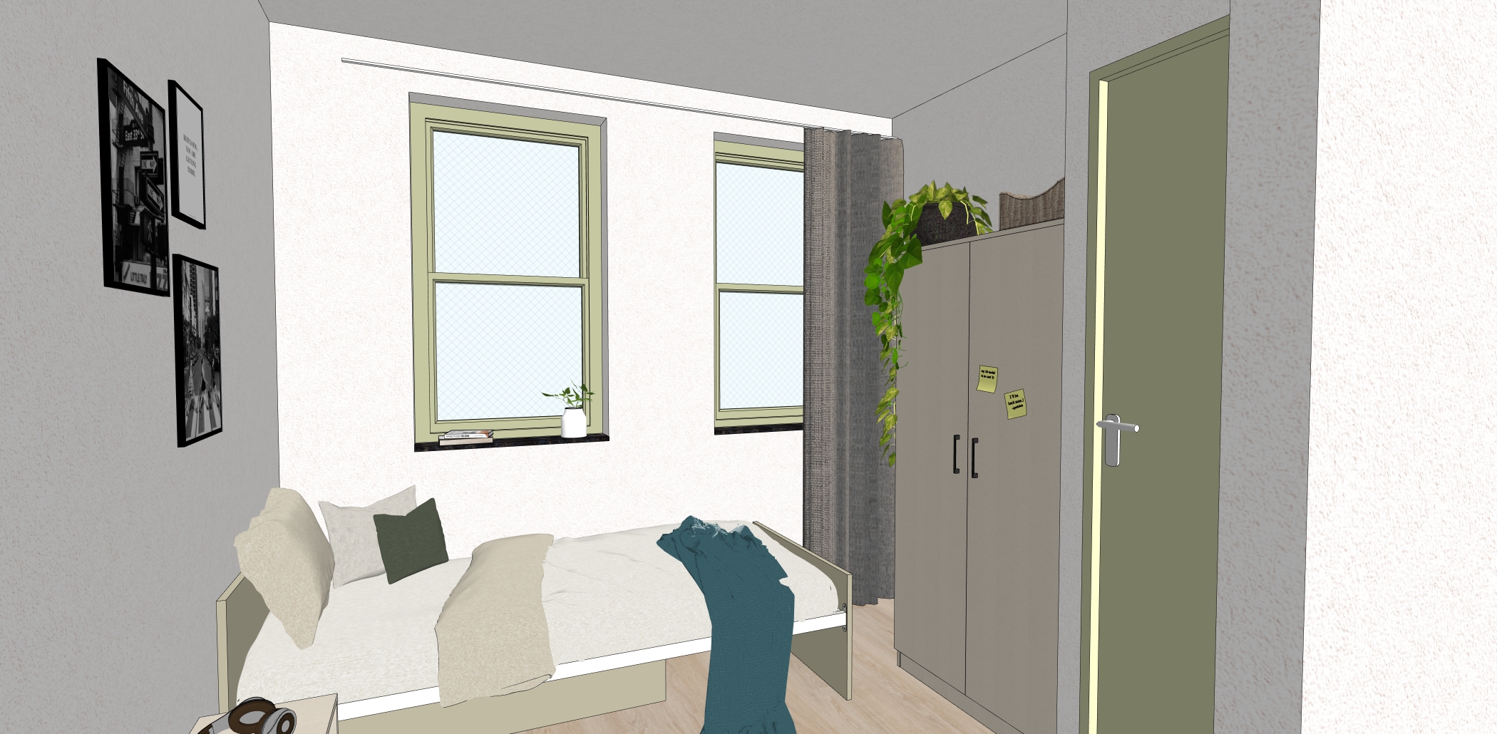 daylight small dutch neigborhood view bed frame is sage green from egger closet and nightstand textile beige from egger door and window frame are sage green