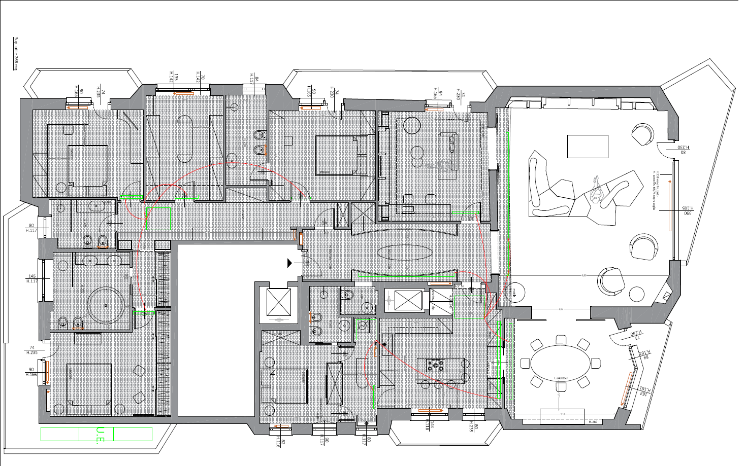 convert this floor plan into a realistic isometric 3d view of a full house show the space from an elevated angle with furniture walls and details visible crea una vista dall alto tridimensionale arredando gli spazi con un parquet in rovere opaco a spina francese tranne che nei bagni e la cucina dove prevedi un travertino use the same furniture as shows on the plan do not change the orientation of the floorplan