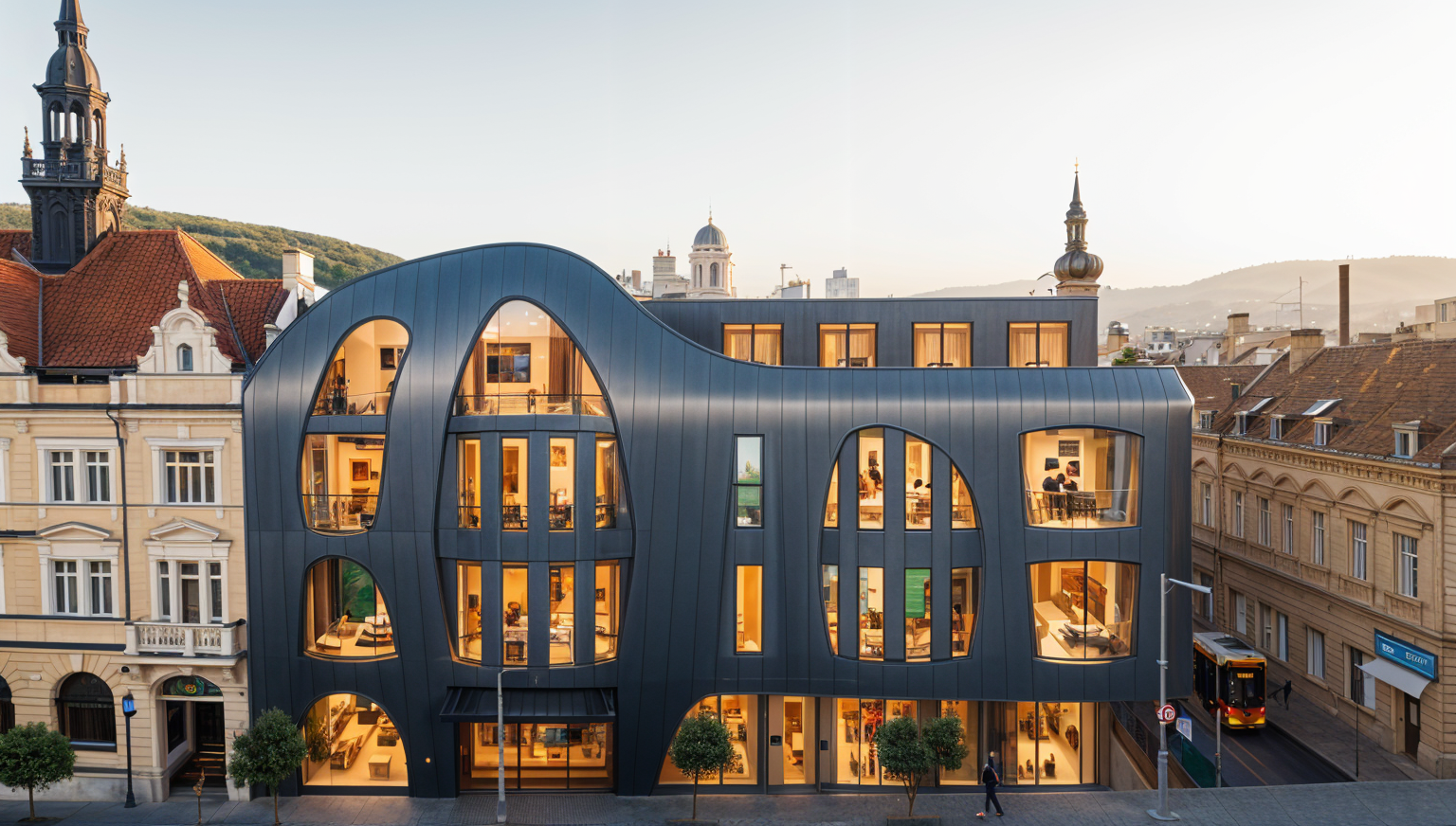 transform this sketchup style architectural render by removing the background and replacing it with a subtle ambient environment that enhances realism maintain a monochrome or black and white aesthetic for the finishes but bring the structure itself into soft realistic colour to highlight constructability enhance material details and lighting to reduce the flat digital look and make the image feel more photographic generate multiple variations with slight differences in ambience and lighting to explore visual impact for web presentation