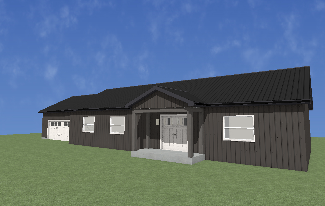 a high resolution photorealistic rendering of a modern single story house with a dark vertical wood exterior and black metal roof the house has a gable entry porch with two columns white framed windows and a white double front door the attached garage has matching white doors maintain all dimensions proportions and architectural details exactly as shown place the house in a lush forest setting with tall green trees surrounding it sunlight filters brightly through the branches casting soft natural shadows on the grass and fa ade the sky is clear blue with light clouds creating a warm inviting atmosphere realistic lighting textures and shadows ultra detailed materials and accurate reflections