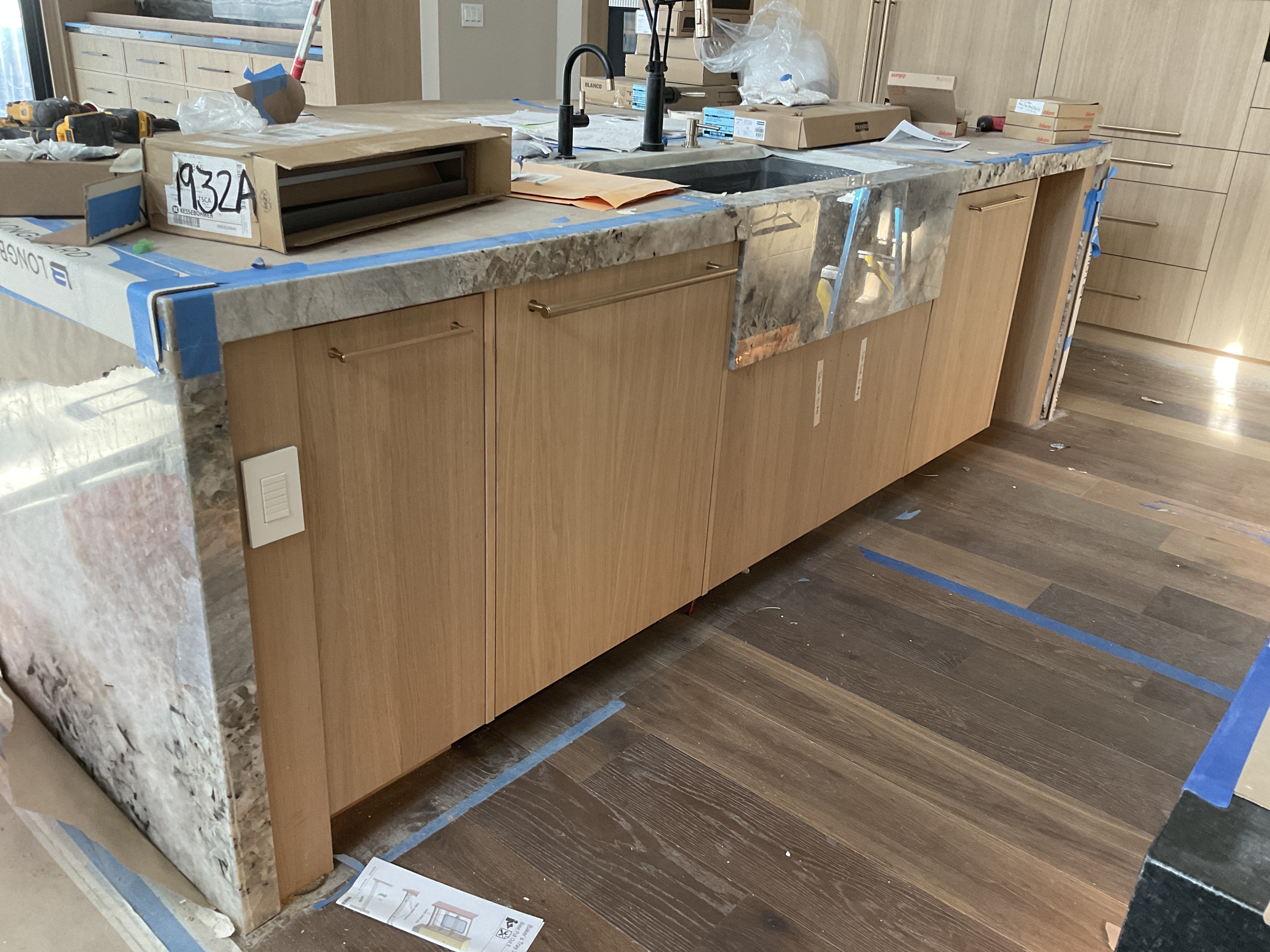 do not change the cabinets in any way preserve the exact cabinet colors materials finishes dimensions door and drawer styles hardware spacing alignment and all geometry exactly as shown do not alter the countertop shape backsplash appliances flooring lighting fixtures or wall structure only remove the construction materials clutter and mess from the scene clean the room and make it look finished and staged add a few simple tasteful home accessories appropriate for the style of the space but do not add or remove any furniture windows or architectural elements maintain the original lighting direction and realism enhance clarity and polish the photo while keeping the cabinetry and room design completely unchanged do not alter the lighting to keep the cabinet colors as they are in the image add an icemaker in the opening on the right end of the island stage for a kitchen keep the perspective as is