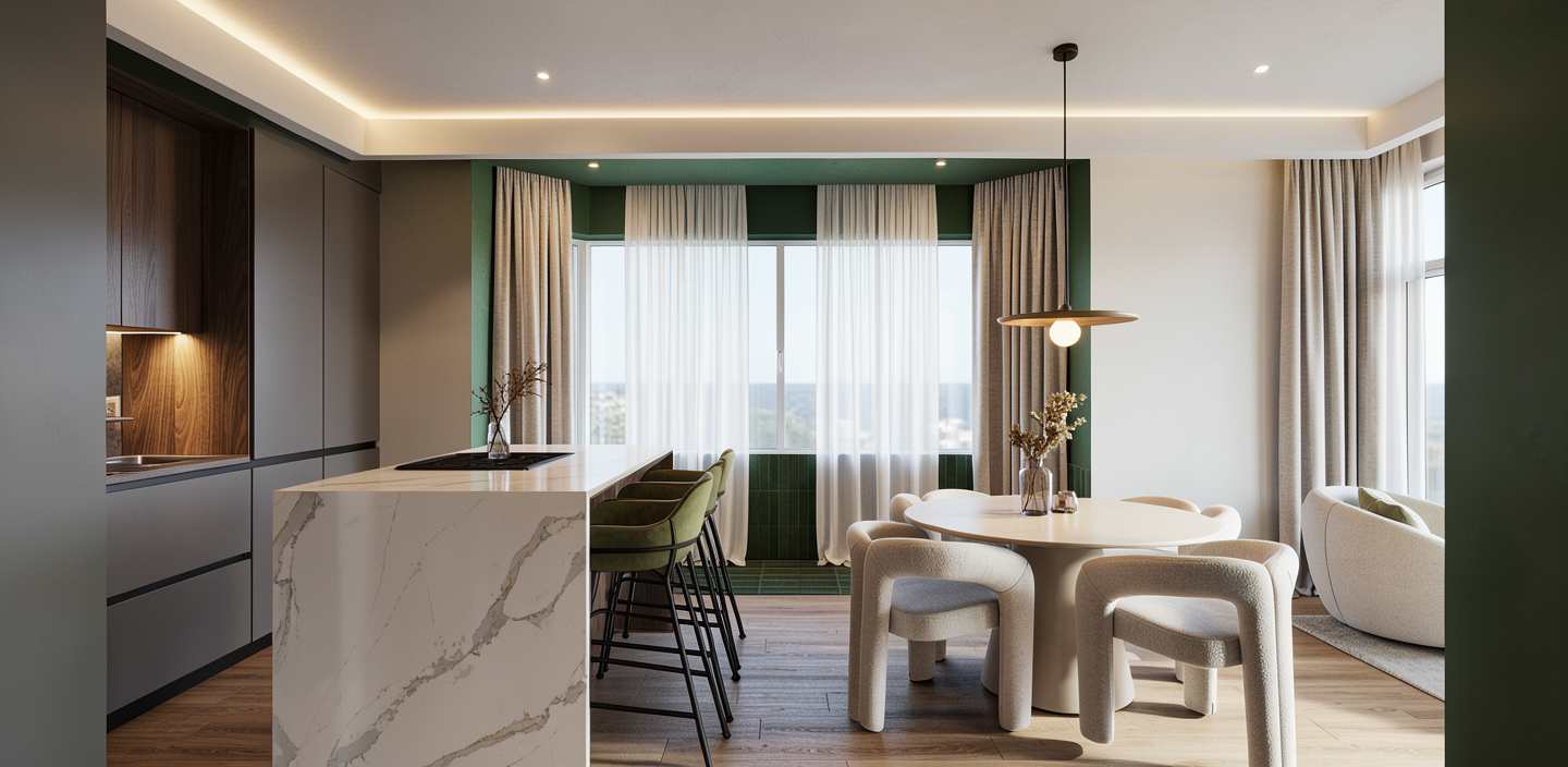 a modern kitchen interior design with a minimalist and elegant style the upper and bottom cabinets are in a champagne metallic paint color with soft brush texture evoking warmth and sophistication backsplash are in a light beige shade offering contrast and brightness the countertop is a sleek polished white marble adding luxury to the setting the door on the right is a rich warm terracotta mate finish fine color the faucet is a contemporary metallic silver reflecting a clean and functional aesthetic the overall atmosphere is cozy and inviting with a balanced mix of neutral tones and warm accents soft shadows no handles warm sunlight