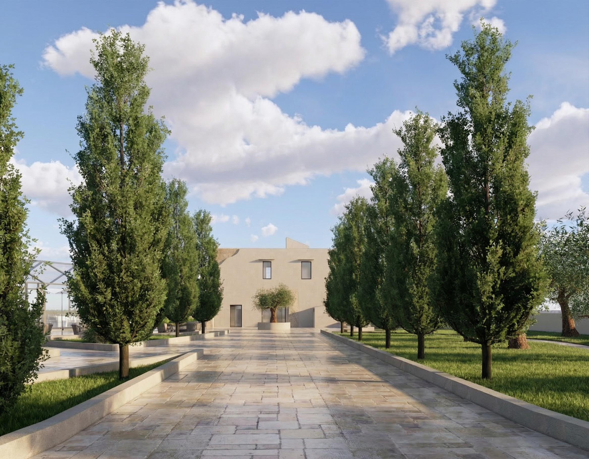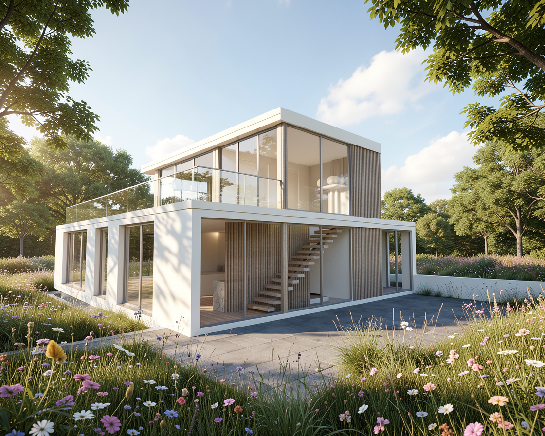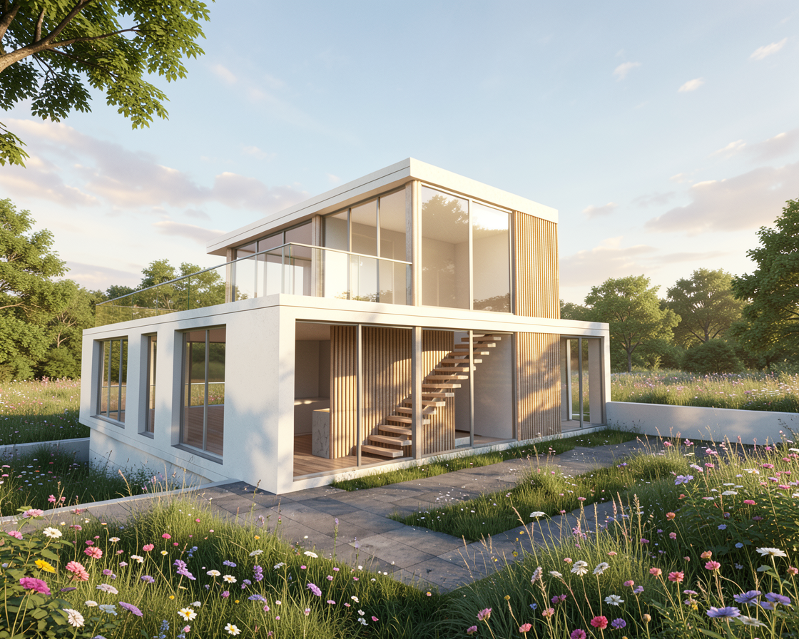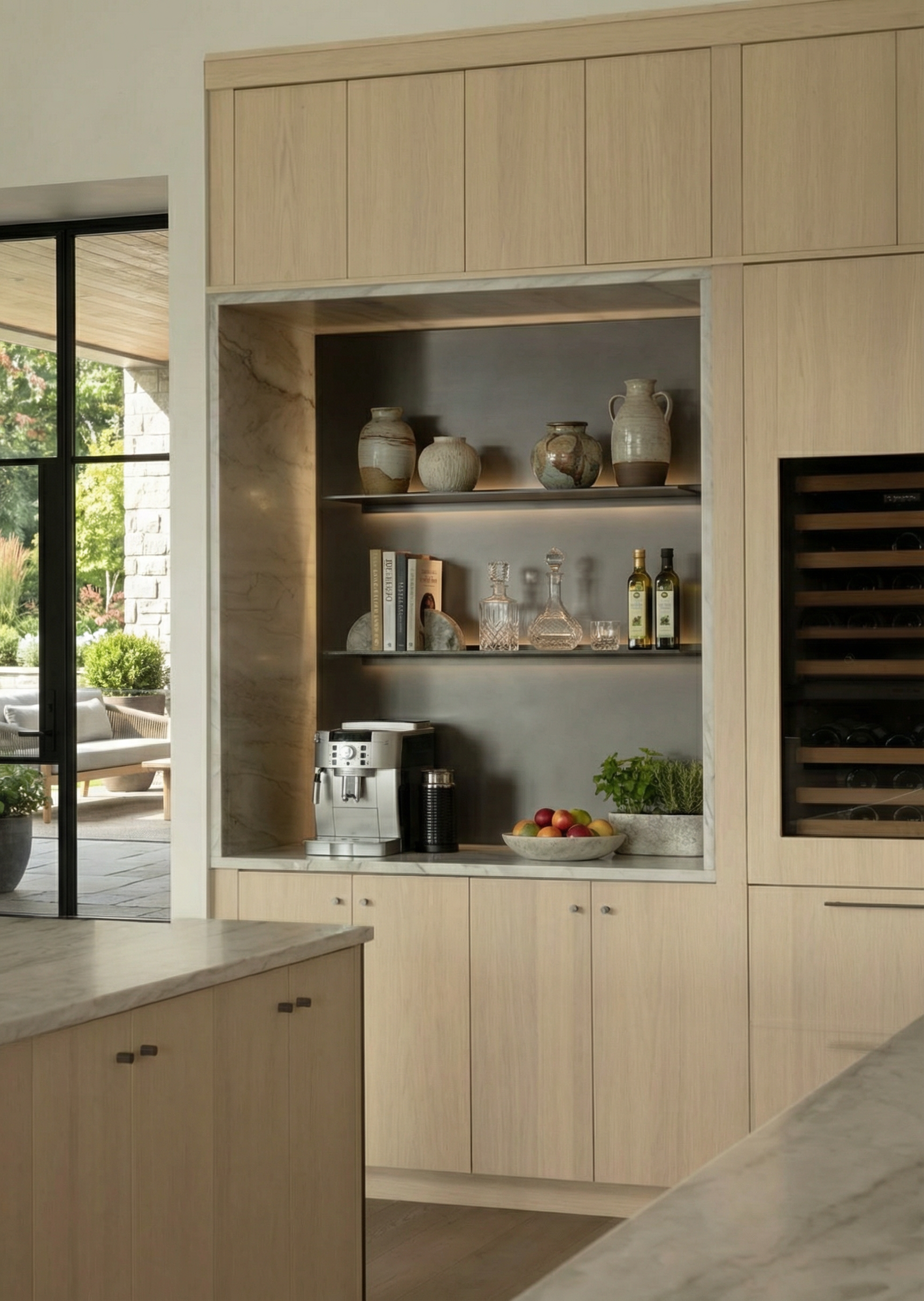 photorealistic render strictly based on the provided reference image of a tradeshow booth match geometry proportions layout and design exactly as shown do not add remove or reinterpret any elements open corner booth structure with flat roof and exposed vertical and horizontal beams in medium beige natural wood wood has a matte finish and subtle grain no color shift exterior and interior wall panels and all cabinetry in very dark red brown color ncs s 8010 y90r matte finish uniform tone cabinet doors are recessed panel style dark finish no added detailing cabinets doors that are see through have glass centers and the interiors of those cabinets are softly lit lighting replicated from the model pendant lights positioned exactly as shown neutral soft warm white light no dramatic lighting effects camera angle perspective and framing match the reference image as closely as possible background kept minimal and neutral no branding emphasis no stylistic enhancement render style clean realistic accurate material translation even lighting architectural feel the ateliers jacob logo should be retro lit and installed on the arch on the right hand side in a minimalist look