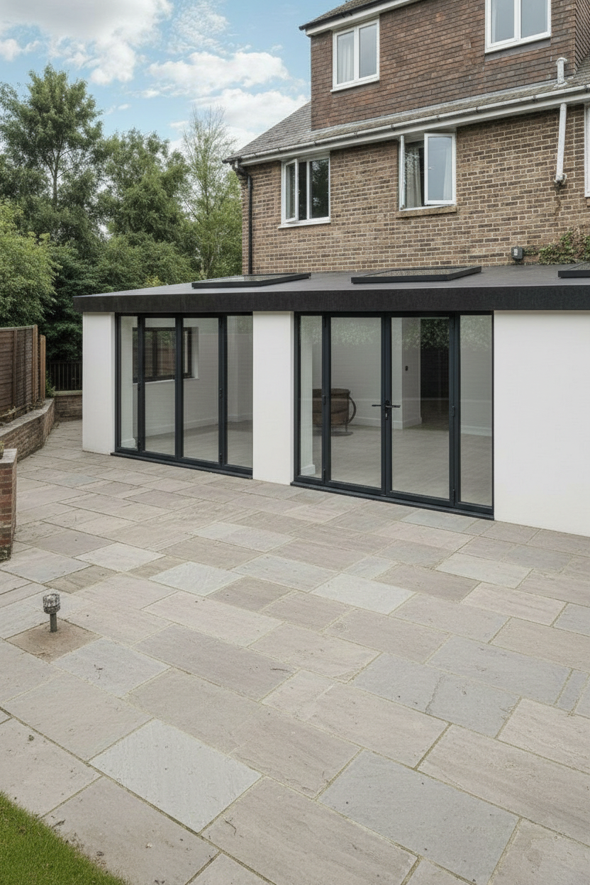 replace the extension with a new one for the whole lenght of the house with pivot doors