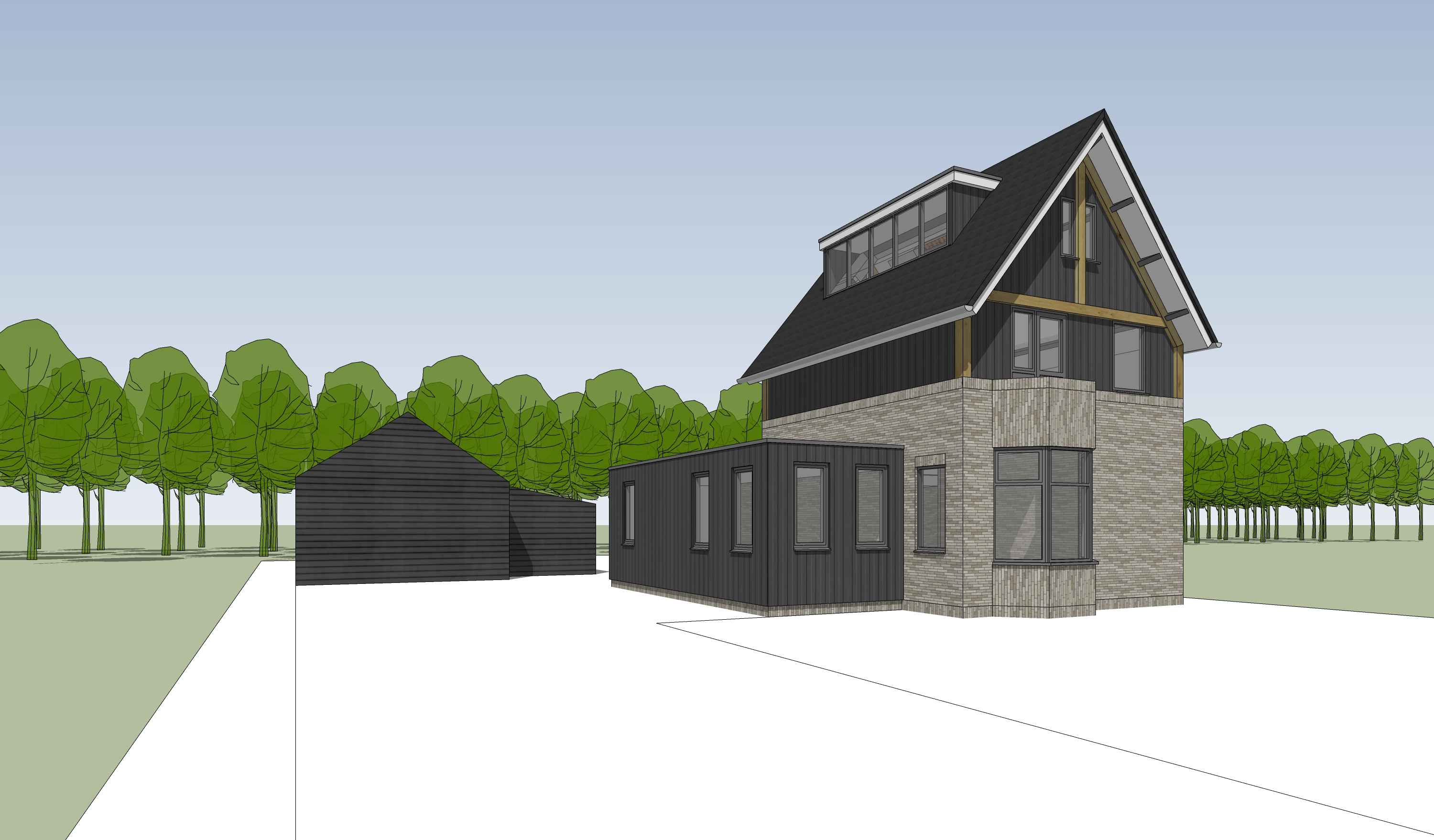 realistische render met erf links op voorgrond en gras rechts op voorgrond met een paar mensen en een bos op de achtergrond