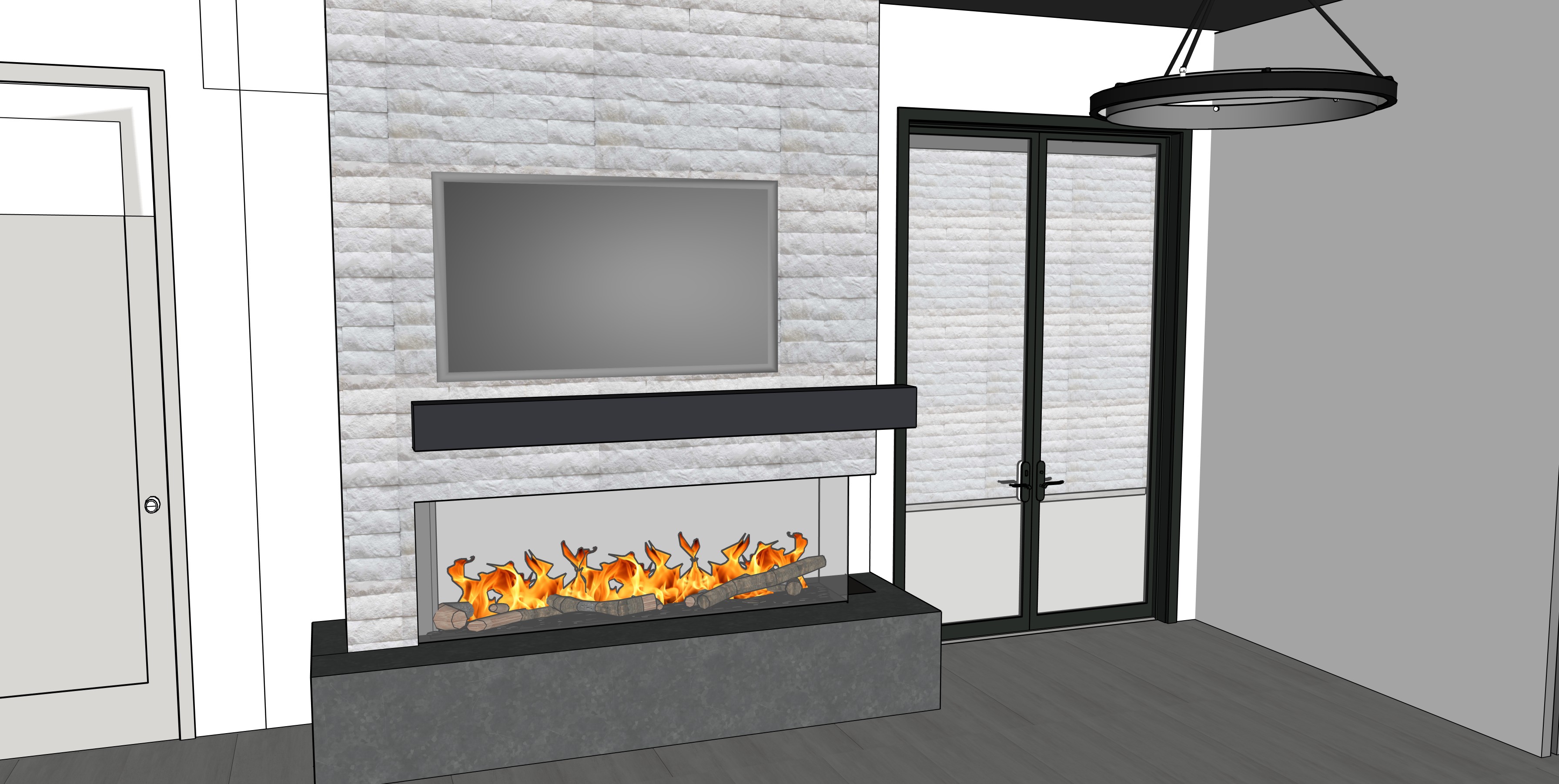 render an ultra modern room interior with high ceilings fireplace has a concrete mantle and cold rolled steel hearth white textured splitface stone surround floors are a light grey concrete tile the doors to the right lead to a private patio with water feature door to the left greige color walls are white