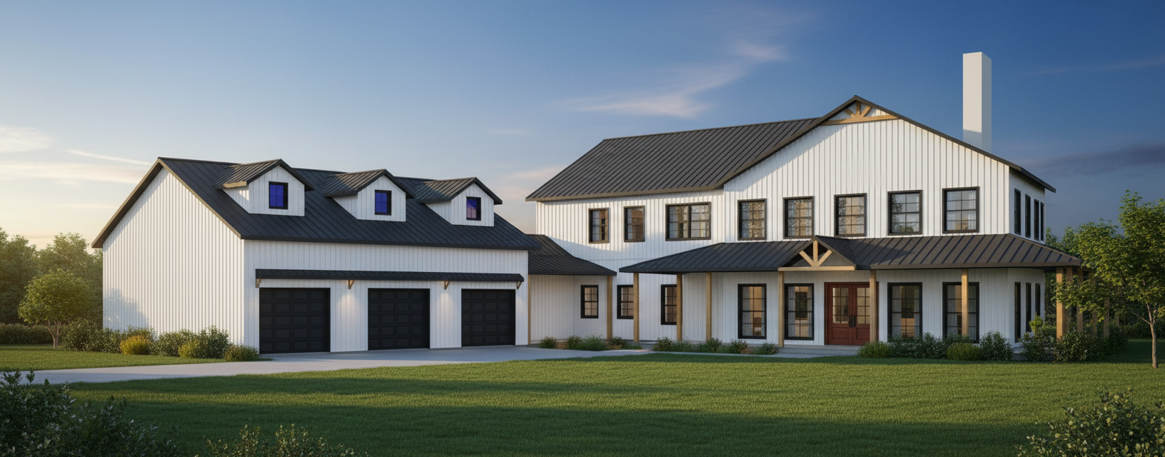 barndominium exterior shot craft a detailed architectural rendering of a modern farmhouse with a two story structure and three car garage use a bright white exterior with dark charcoal metal roofing for a sleek contemporary look the windows and doors should have black frames highlighting the symmetrical design add warm yellow lighting emanating from the windows to create a welcoming atmosphere set the building against a backdrop of lush green landscaping with a clear blue sky to convey a peaceful sunny day make it flat and direct front view architecture