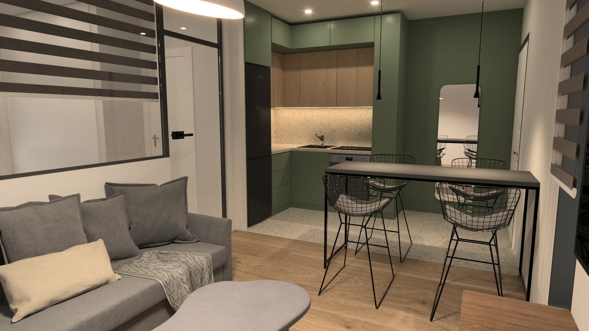 a modern cozy living room and kitchen interior the walls are a soothing sage green accented with light wood cabinetry the bar stools are contemporary metal with a sleek black finish the sofa is upholstered in soft grey fabric with a beige cushion for contrast adding warmth hardwood floors are light oak paired with a minimalist dining table in black a large soft grey rug complements the space the lighting is warm and inviting with subtle spotlights enhancing the peaceful atmosphere horizontal blinds in dark grey add a modern touch the overall atmosphere is calm stylish and welcoming