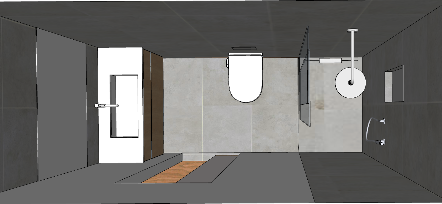 ba o visto desde arriba lavabo con espejo entero en pared inodoro con cisterna empotrada y ducha de obra la ducha solo tiene una rejilla de salida de agua pegada a la pared con acabado cer mico pavimento cer mico gris de gran formato y puerta blanca de entrada con apertura corredera vista cenital grifo de ducha y rociador de ducha en acero inox mate mueble de lavabo en tono madera lavabo en color blanco en la ducha hay una luz rasantemanten el formato de la imagen original