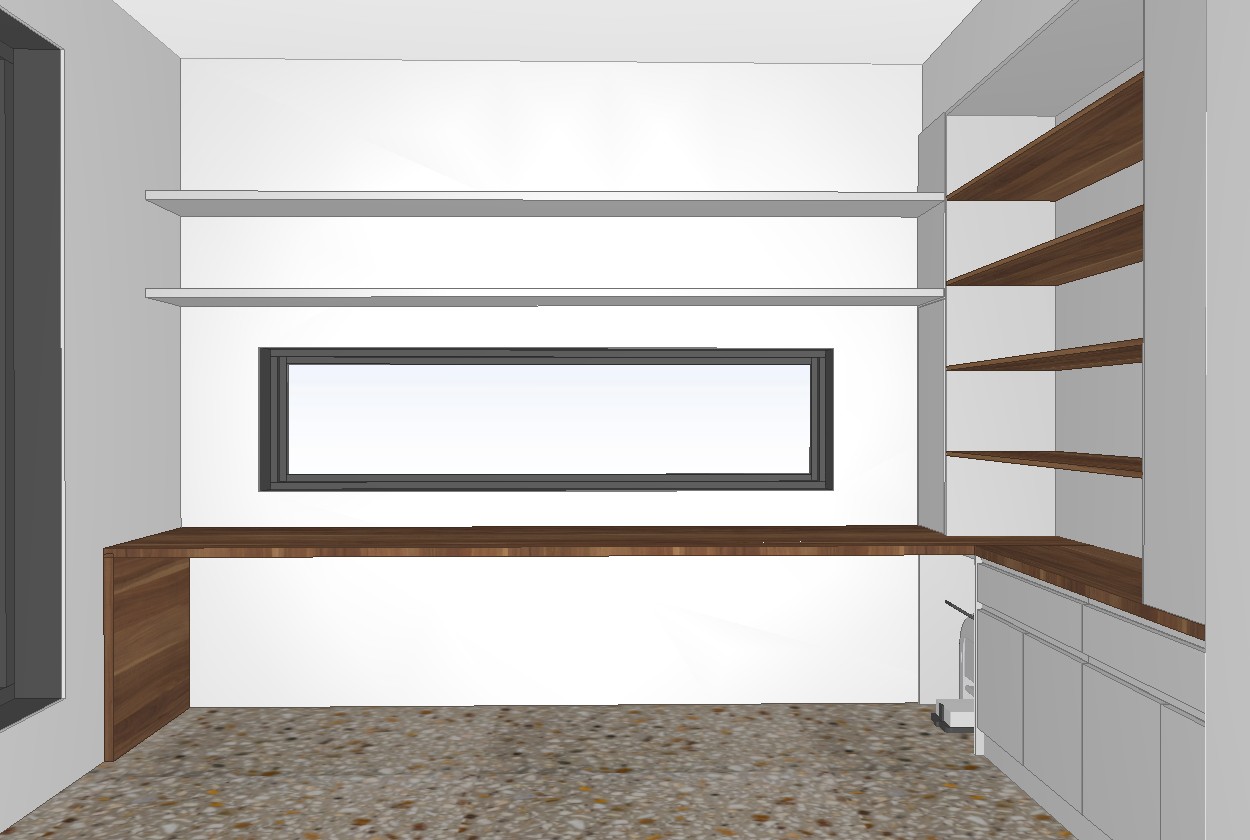 add natural lighting coming through windows 2 people sitting at the desk add filing decor to shelves above window and books on the shelving to the right side