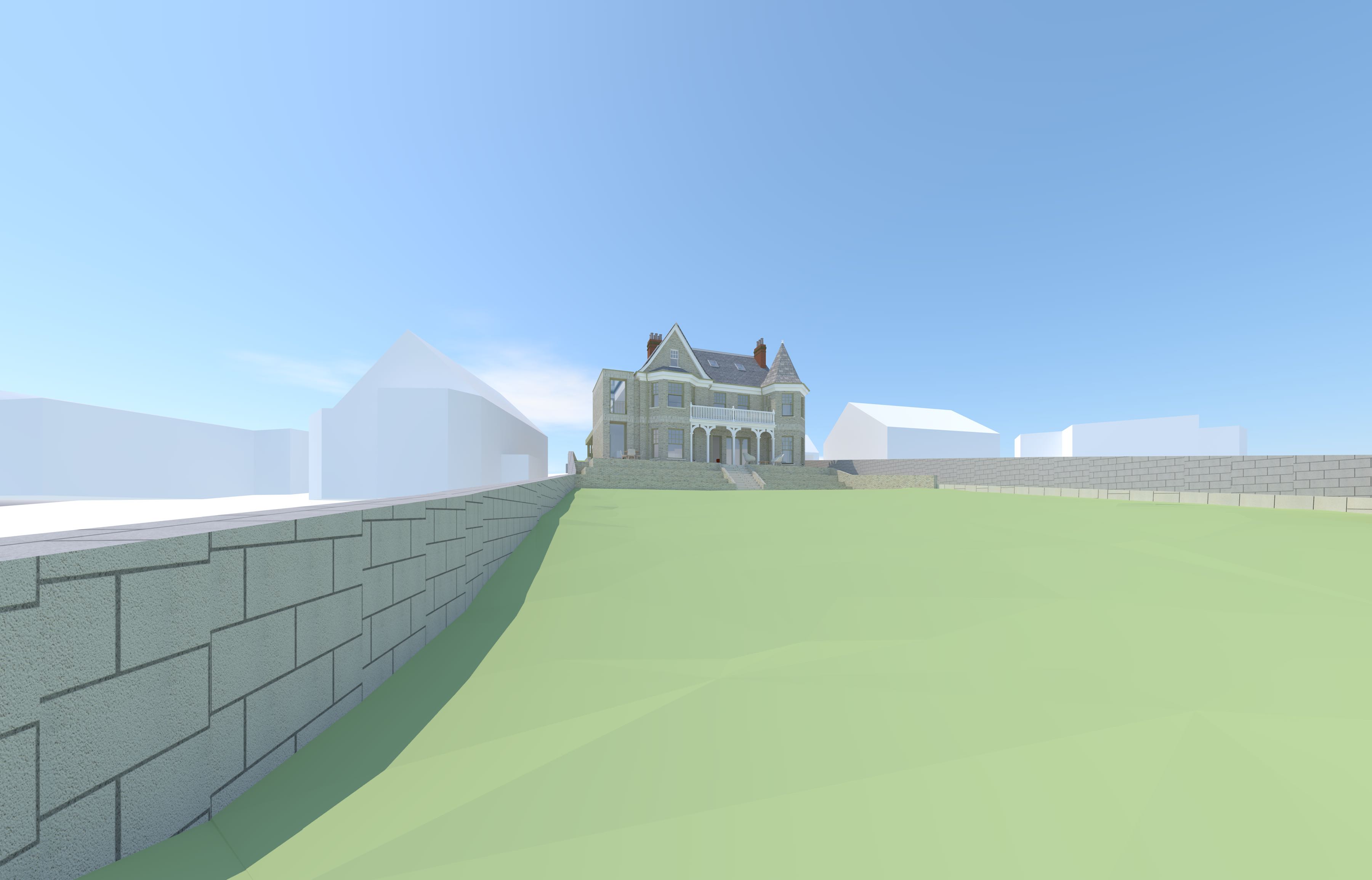 can you make this photorealistic with a lawn in the foreground native cornish planting and hedging against the boundaries with a few varied native trees in there perhaps some palms or a bananna plant and then planting and shrubs into he planters infant of the building itself with a pale cornish blue sky