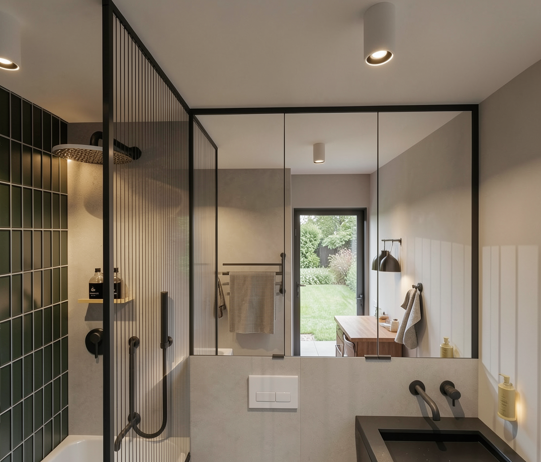 please remove the sunshine it is a closed space without windows make the teal bookcases a little deeper the wall on the right is a mirror