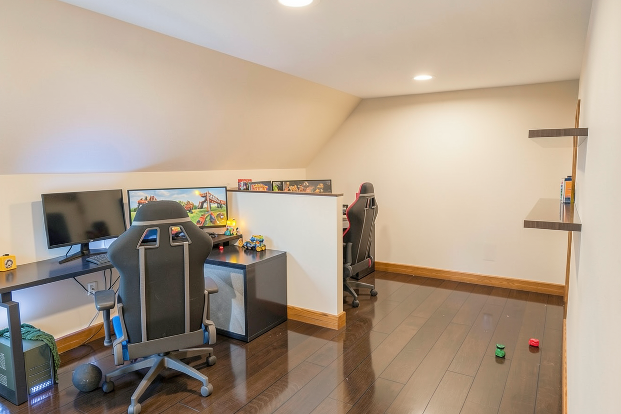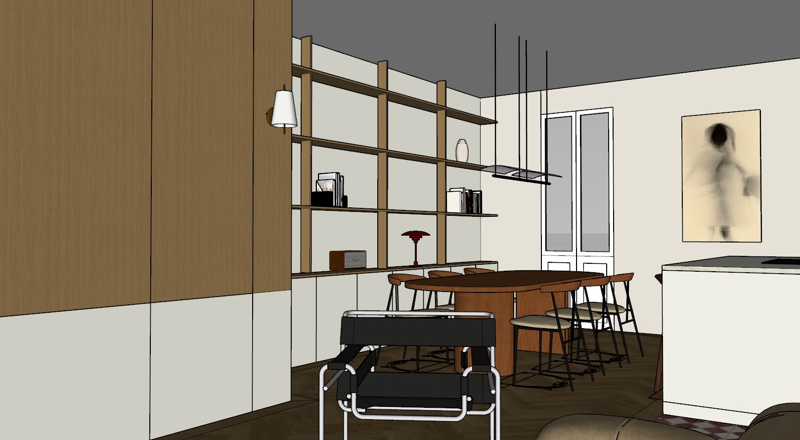 mantain precise materials and colors turn on warm lights and make walls a bit more beige add a eixample building from barcelona in the window view first chair in the image has black leather and reflective aluminium profiles there is no plant under the wall paint and red lamp in the shelves is turned on