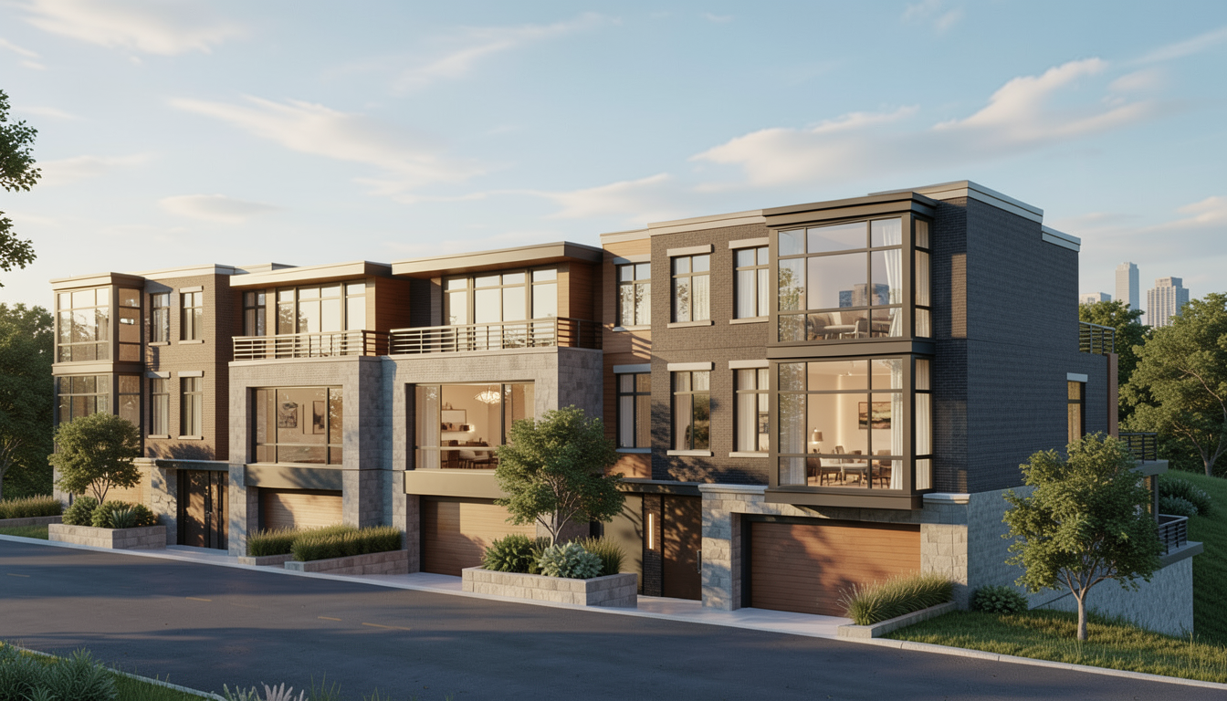 ultra photorealistic architectural rendering in a cinematic real time visualization style unreal engine d5 render quality late morning daylight with slightly angled sun creating soft defined shadows balanced exposure with no blown highlights low bloom and controlled dynamic range warm neutral color grading with subtle warm highlights and neutral shadows no blue tint natural material response with warm light reflecting off wood and ground surfaces slight contrast boost with clean crisp edges and subtle ambient occlusion clear atmosphere with no fog or haze but natural depth created through slight background softening and contrast falloff foreground and main subject remain sharp and detailed minimal curated landscaping with natural but slightly desaturated greenery no overgrown vegetation cinematic composition realistic sky with soft blue tones and light clouds professional architectural visualization style sharp focus 8k resolution lit and fully furnished interiors behind windows warm lighting road with driveways to garages in foreground black brick with wood and stone materials view of city of cincinnati ohio in the background with trees