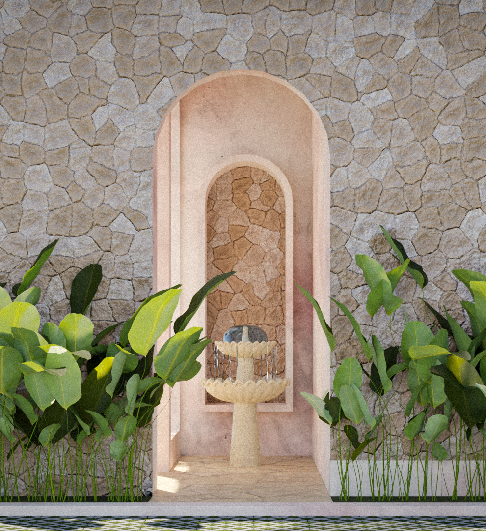 generate a hyper realistic render of the villa entrance keep the spatial design identical to the reference enchance materials lighting and textures for the photorealism leaves stone wall water shadows plants make the lighting bright cozy natural dont let the water fountain flow into the floor ultra high resolution like a professional architectureal photo
