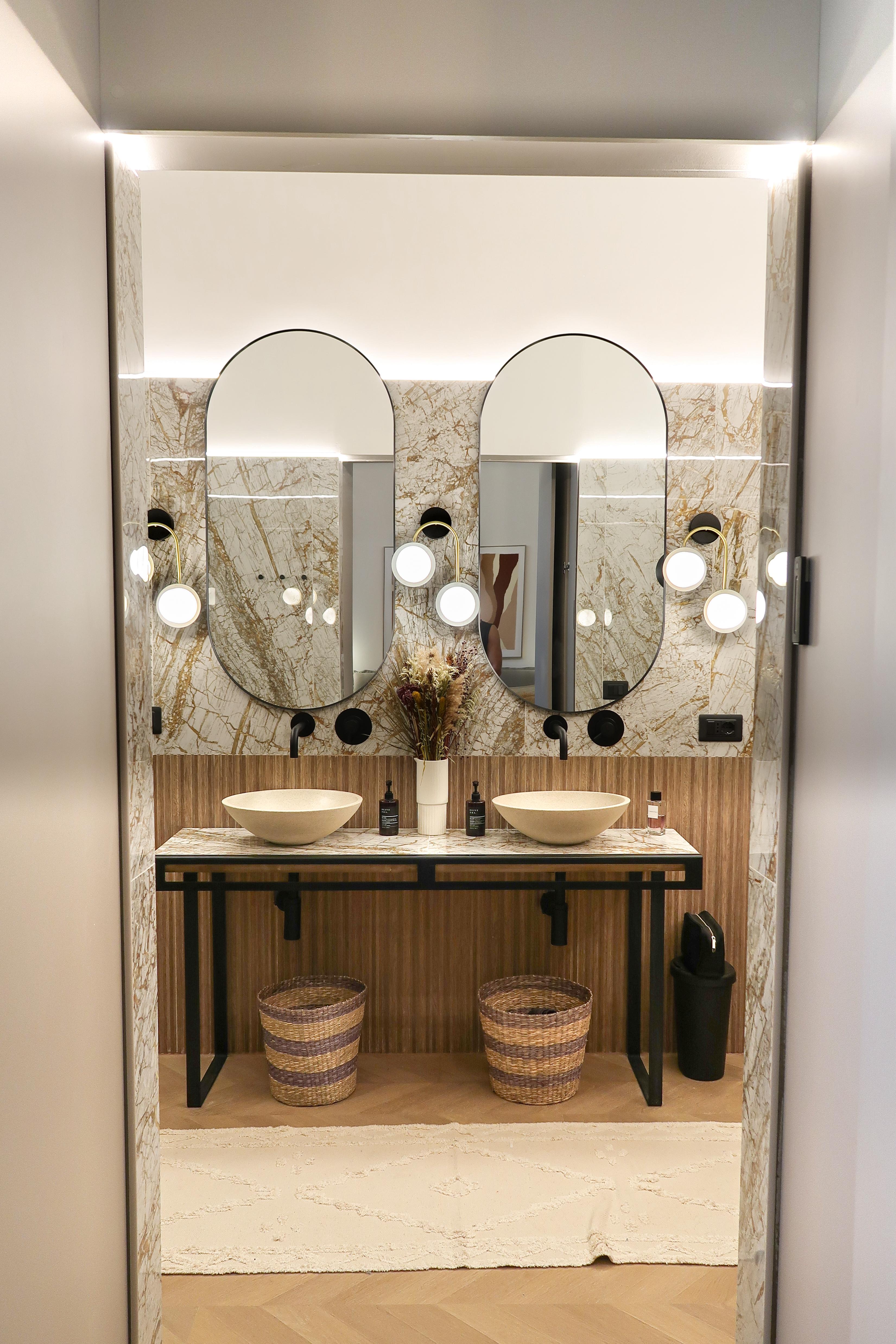 photorealistic architectural photography of a luxury bathroom soft natural sunlight flowing from led lights high end interior design hyper realistic textures 8k resolution cinematic lighting minimalist aesthetic sharp focus ad some decorations and some details as ad magazine style do not add windows to the pic no too much natural light just light from the led lamps soft and confort effect like a luxurious hotel bathroom