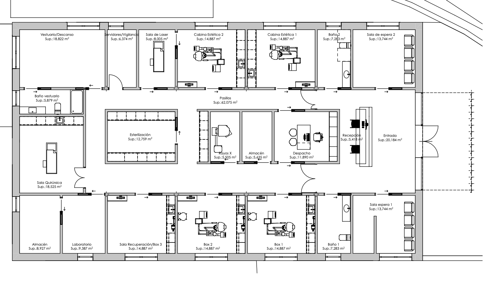 convert this floor plan into a realistic isometric 3d view of a office show the space from an elevated angle with furniture walls and details visible modern dental clinic building with traditional materials and a iluminated and white indoor use the same furniture as shows on the plan do not change the orientation of the floorplan