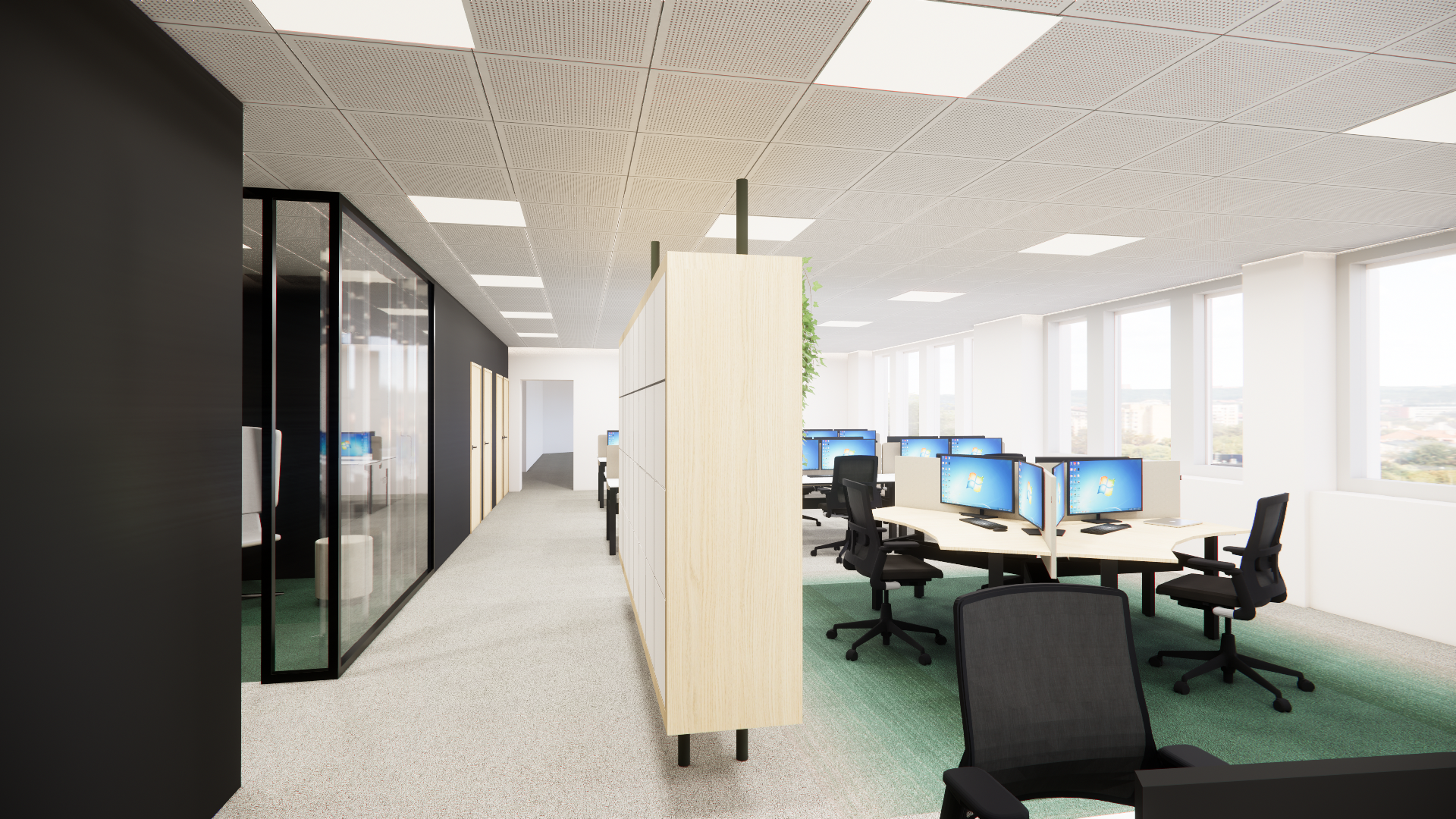 create a stunning 3d rendering of a modern office meeting room the layout features an light wooden table use warm wooden accents for the table and the door natural light streaming in from large windows enhancing the bright and airy ambiance add a 3 young poeple dont touch to the colors of the floor only the lieft walls our black the right walls are white outside city view with buildings