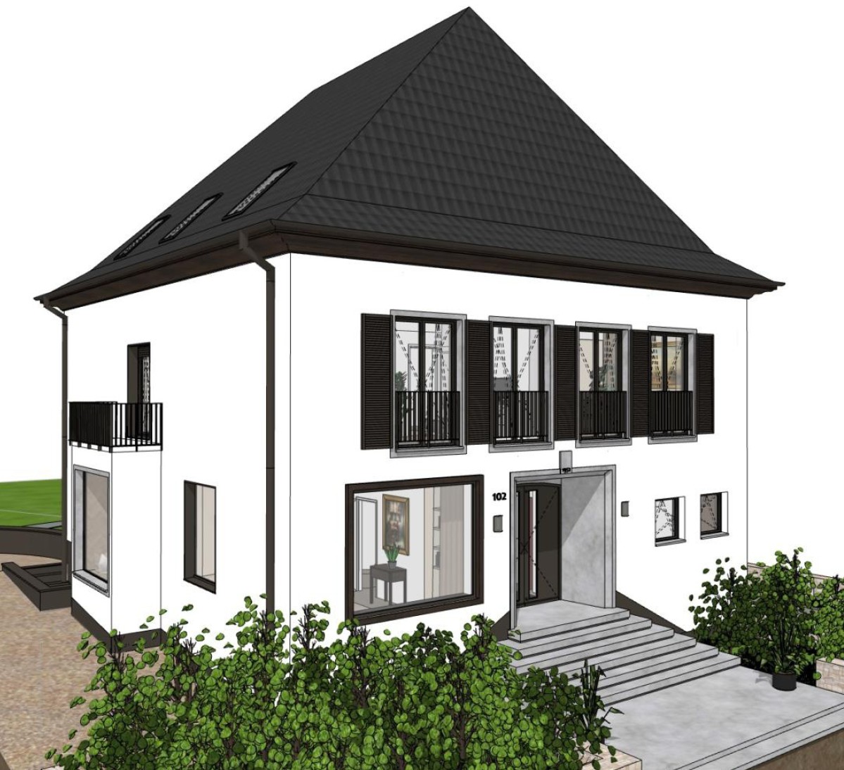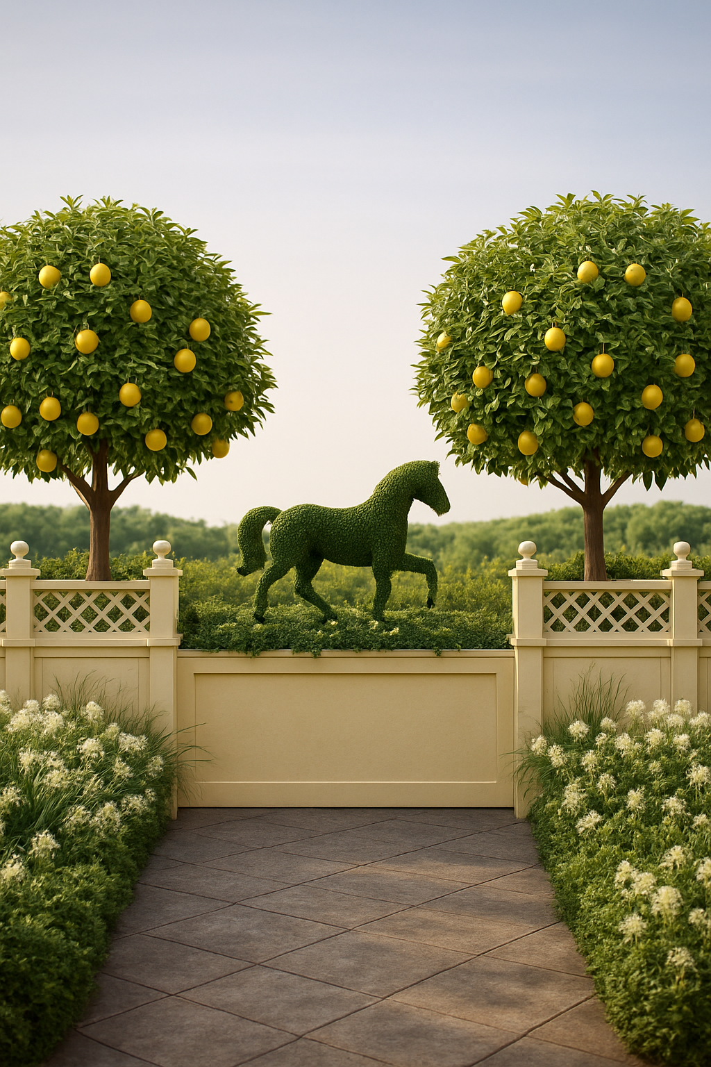 the villa is surrounded by a lot of trees bushes and flowers in the garden entrance gide to carport