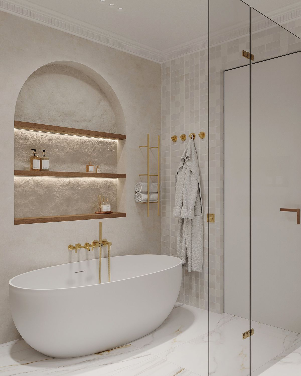 exterior shot update this isometric view with colors presented in moodboard bright walls and floor tiles try to add similar arch around bathtub change lights inside bathroom to something more modern