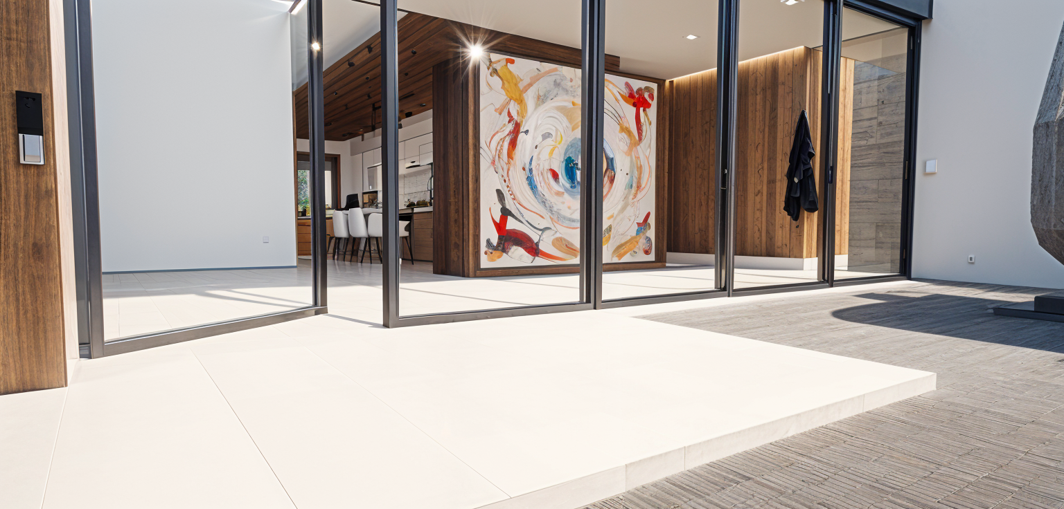 warm gray cedar siding dark gray shingle roof with clean lines ferns along base of building dark window trim and mullions modern stone base on house cloudy afternoon sky lake and longleaf pine forest in background