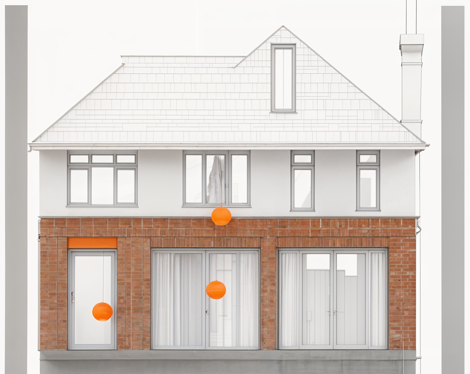 the orange area is a red brick extension with large windows and doors the light grey areas are glass and should be darkened glass the white areas should be kept white do not add unncessary detail the roof at upper level does not have a gable it pitches away from the windows the grey rectangle in the roof is a roof window architecture