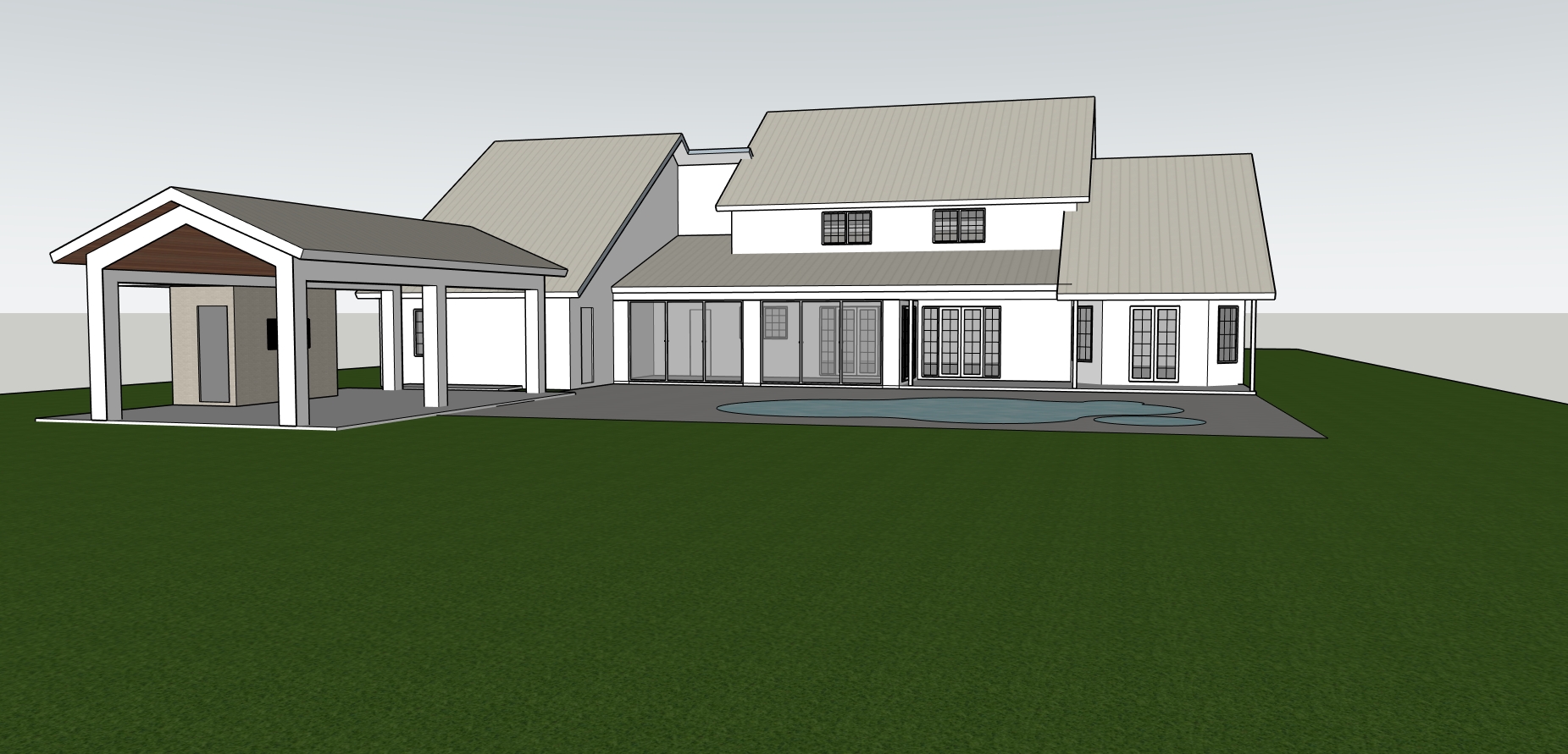 render a charming modern house with a sleek design the house features crisp white walls and a light gray roof incorporate large glass windows and doors for a contemporary touch the front porch has wooden elements in a rich chestnut color adding warmth surround the property with lush vibrant green grass and add a tranquil pool reflecting the serene sky the atmosphere should be calm and inviting with soft natural lighting highlighting the clean architectural lines of the house