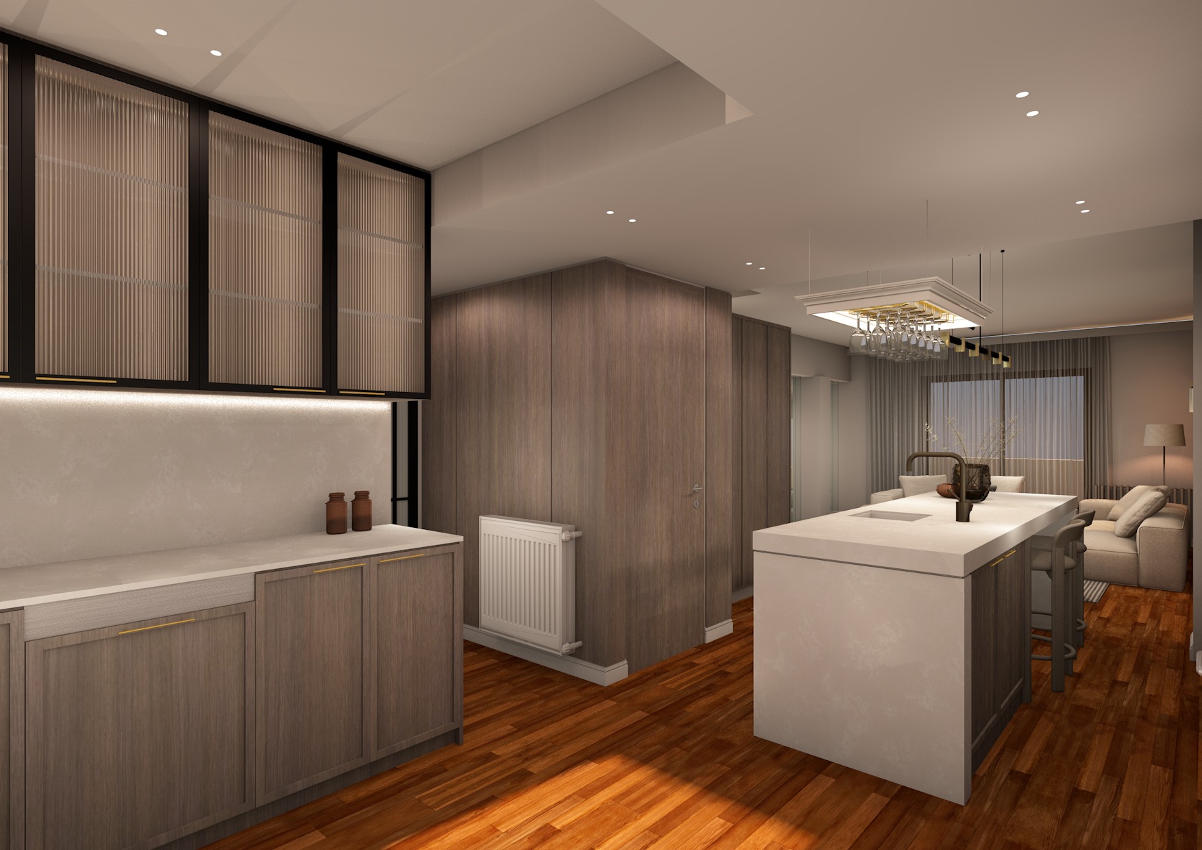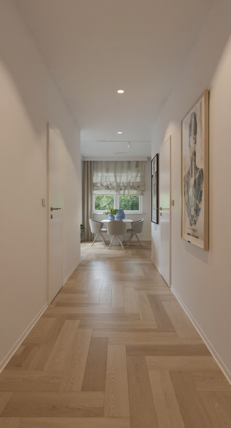 create a serene and modern living room interior the walls are a soft warm beige adorned with light gray paneling enhancing the elegance a large cream colored sectional sofa with a mix of gray and beige textured pillows takes center stage on either side minimalist wall sconces cast a gentle warm glow a contemporary abstract painting above the sofa introduces subtle earth tones like terracotta and charcoal black the coffee table is a sleek dark wood that contrasts the creamy shades around it the floor is rich dark wood with a light gray area rug featuring subtle stripes include delicate details like a small vase with dried flowers and a table lamp with a spherical frosted glass light for a cozy and inviting atmosphere