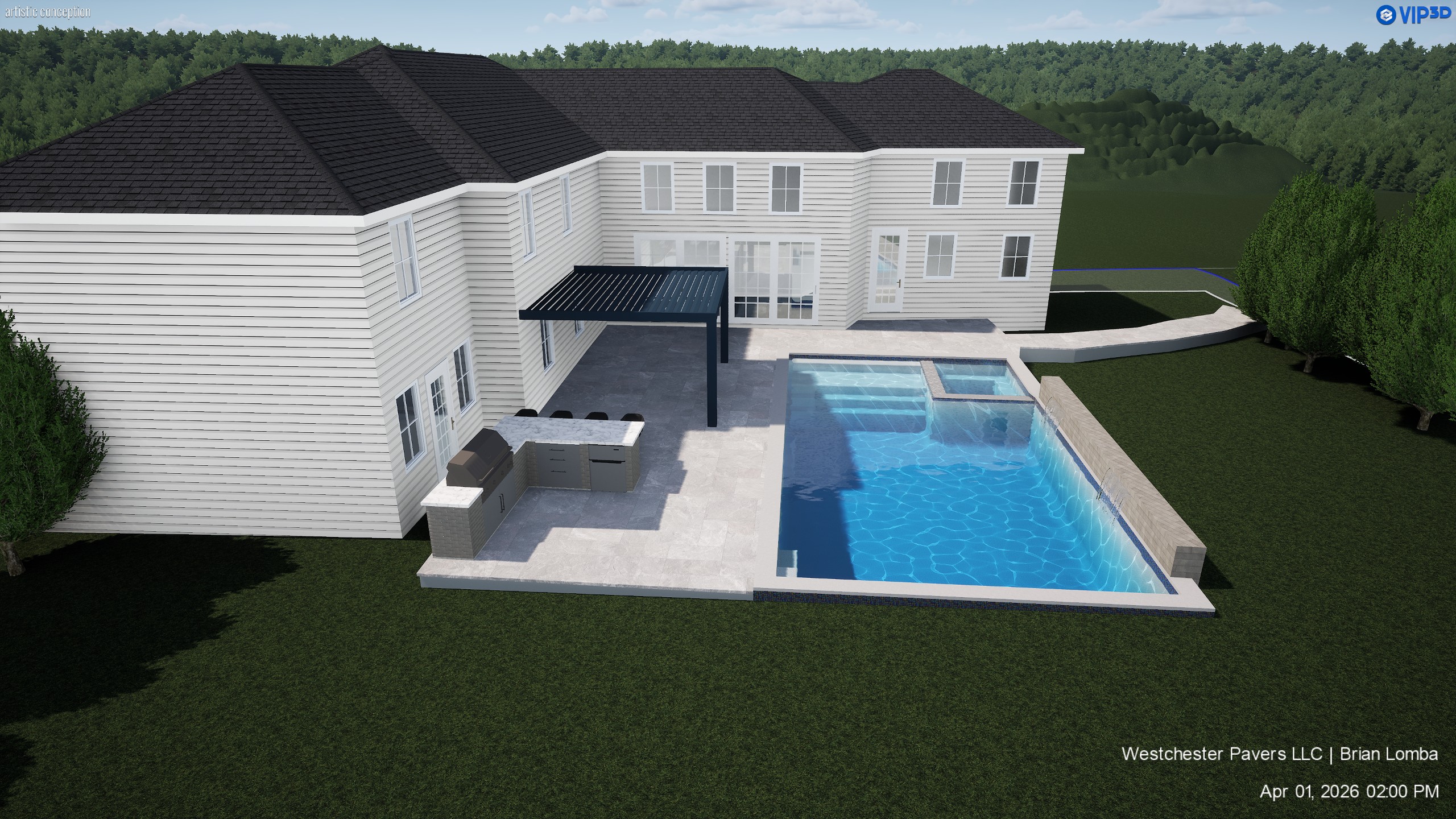 render a luxurious modern house with a spacious backyard featuring a sleek swimming pool the house exterior is painted in a crisp white with elegant dark slate roofing the pool water is a vibrant azure reflecting the clear blue sky above surround the house with lush green grass and tall trees for a serene atmosphere the patio area is crafted from light gray stone hosting a contemporary outdoor kitchen with silver metallic finishes the pergola is a deep navy blue adding a sophisticated accent to the bright setting aim for a peaceful and inviting afternoon ambiance capturing the warmth of the sun and the tranquility of nature home is right in the center of scarsdale ny capture the pool with the in pool spa with a sundeck next to it feature wall along the pool with sheer descents add furniture and tables around the kitchen and under the pergola