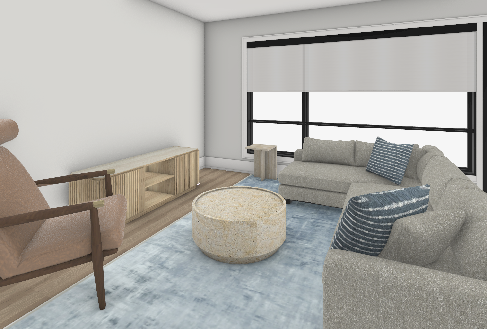 natural lighting light wood tones colorful accents add a city backyard with deck in the background add a tv above media unit and add accessories to coffee table and shelves