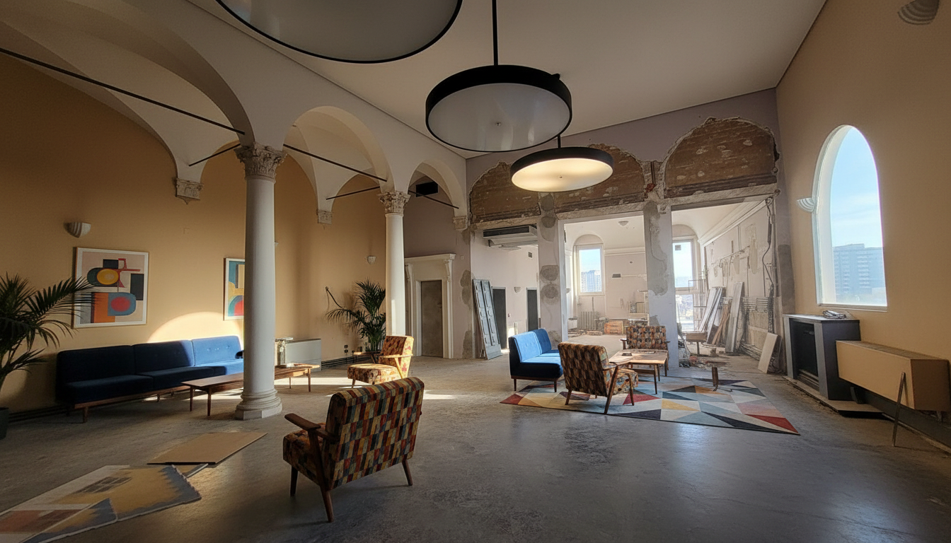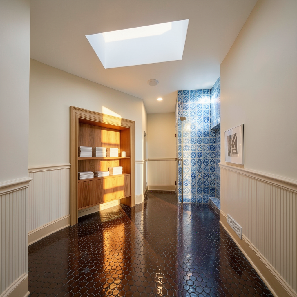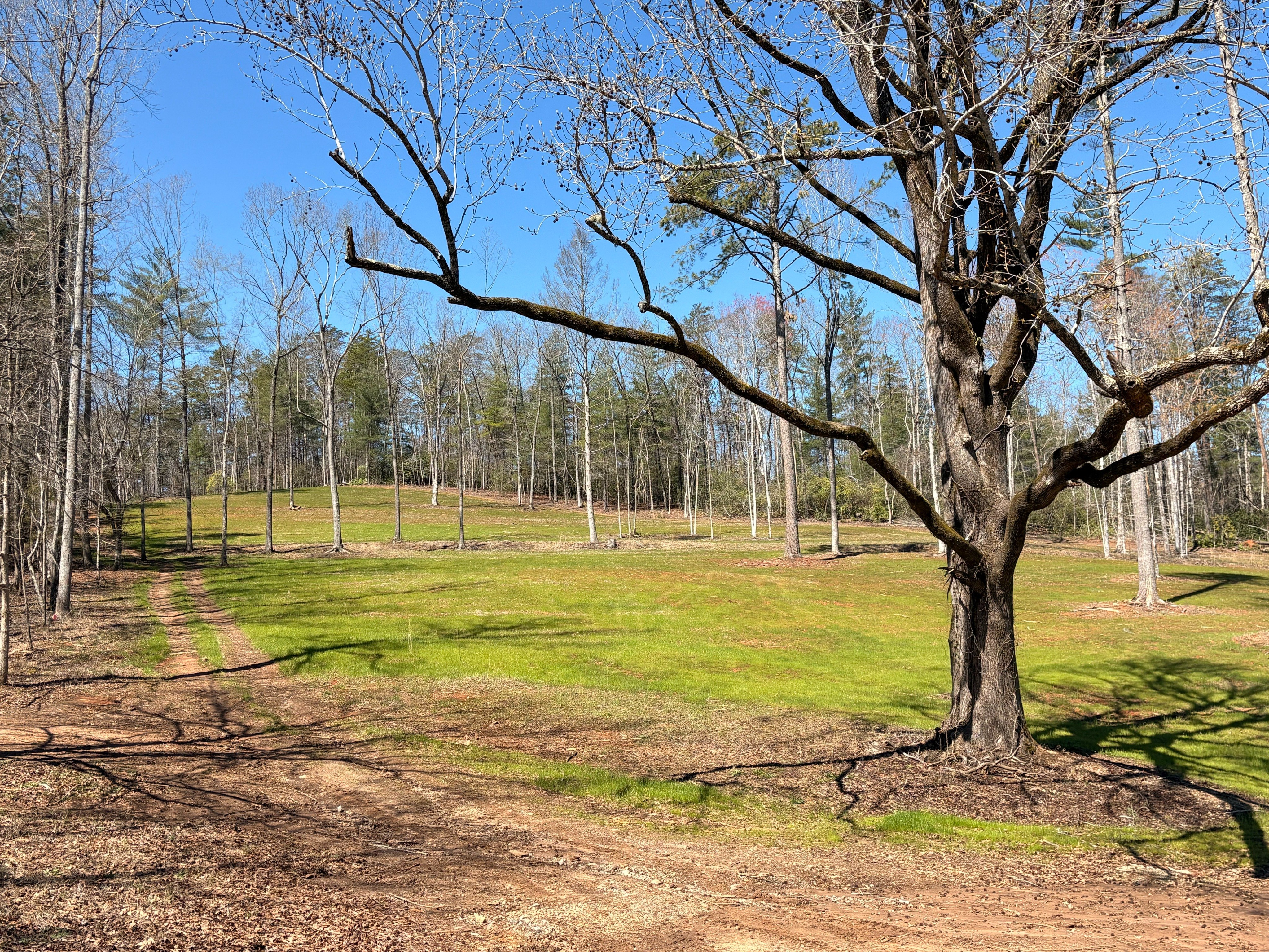 show large lodge structure in style of reference image on top of hill show driveway with landscape lighting along roadway on left going up to lodge add leaves to all trees make grass all green large porch across front of lodge with rocking chairs lodge building in far distance