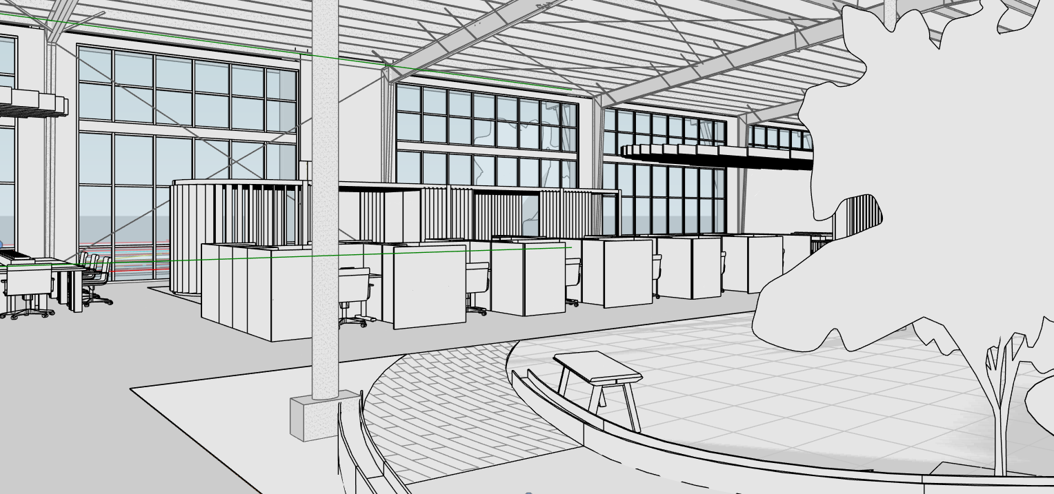make this look realistic make the path a boardwalk with concrete rails filled with plants make the cubicles light grey make the vertical structure behind the cubicles a light teal