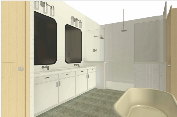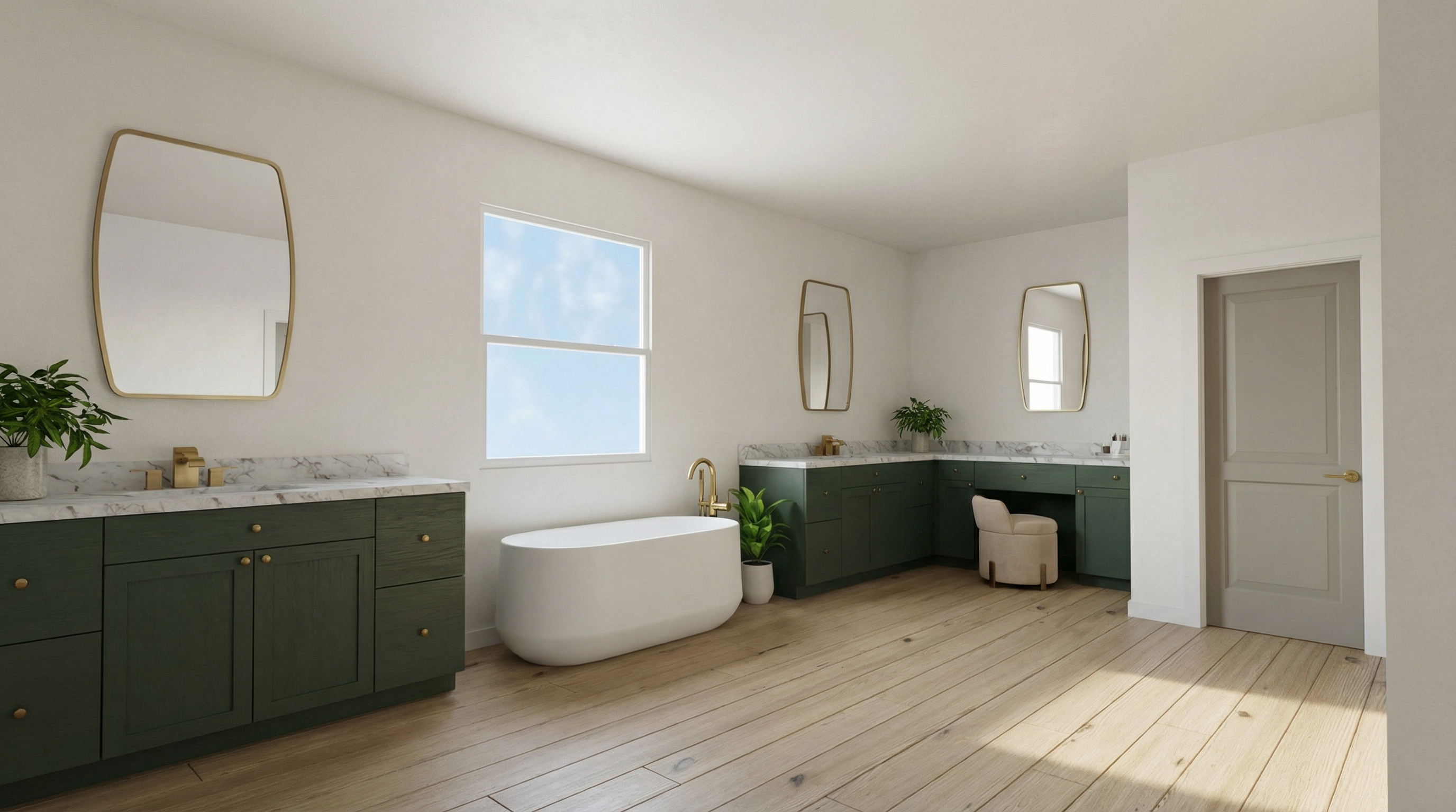 a luxurious and serene bathroom featuring a glass shower enclosure with soft beige tiles and brass fixtures the bathtub is a pristine white complemented by a sleek gray stone floor the double vanity is adorned with marble countertops and warm natural wood cabinets accented by elegant brass hardware the atmosphere is calm and inviting with abundant natural light casting gentle shadows