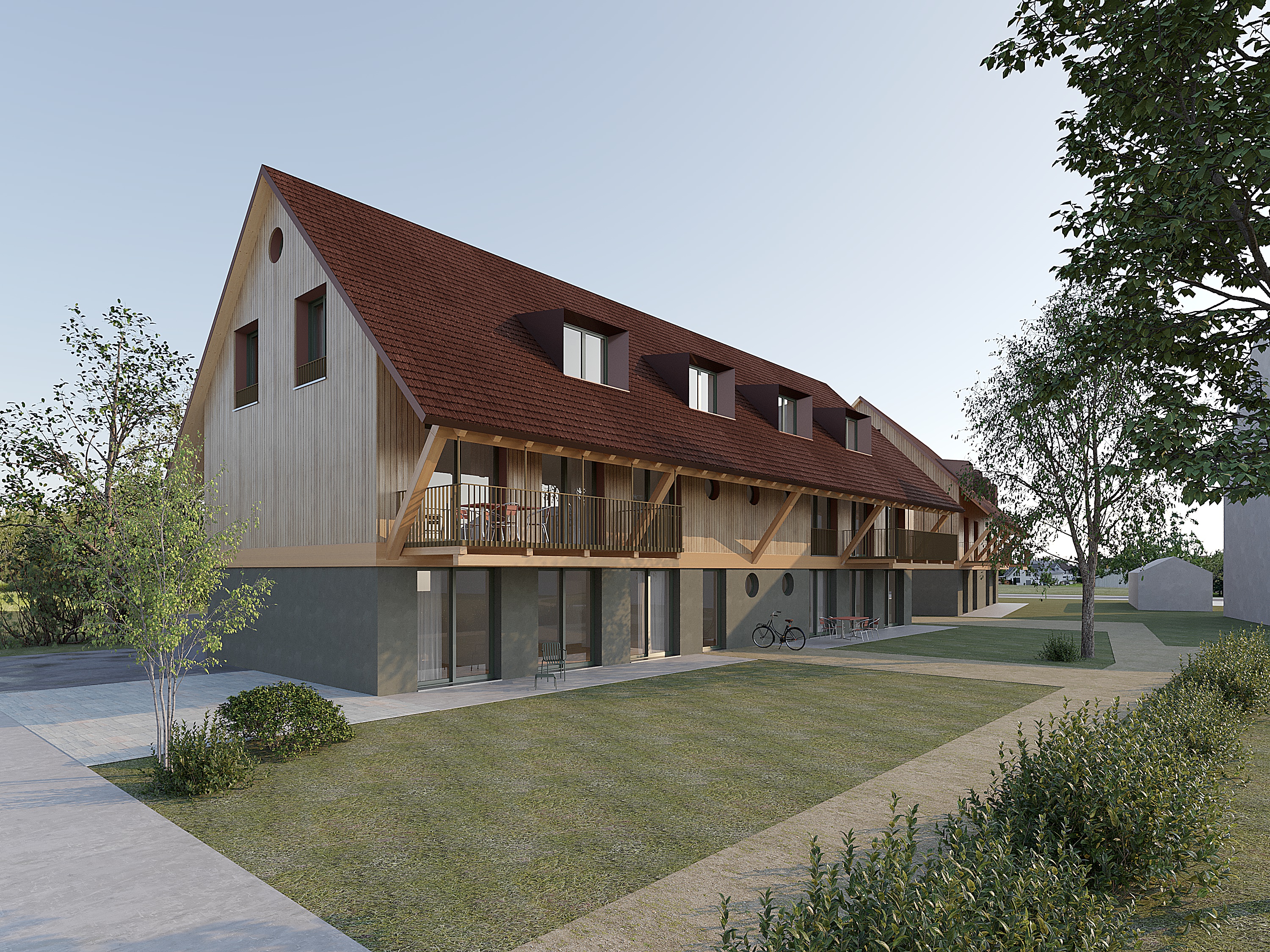 keep the geometry the garden in front of the building is with gras small natural and wild the roof tiles are in brown clear morning sunlight at 10 a m creates crisp geometric shadows on the wall surfaces emphasizing material contrast the sky is clear blue without clouds giving the image strong depth
