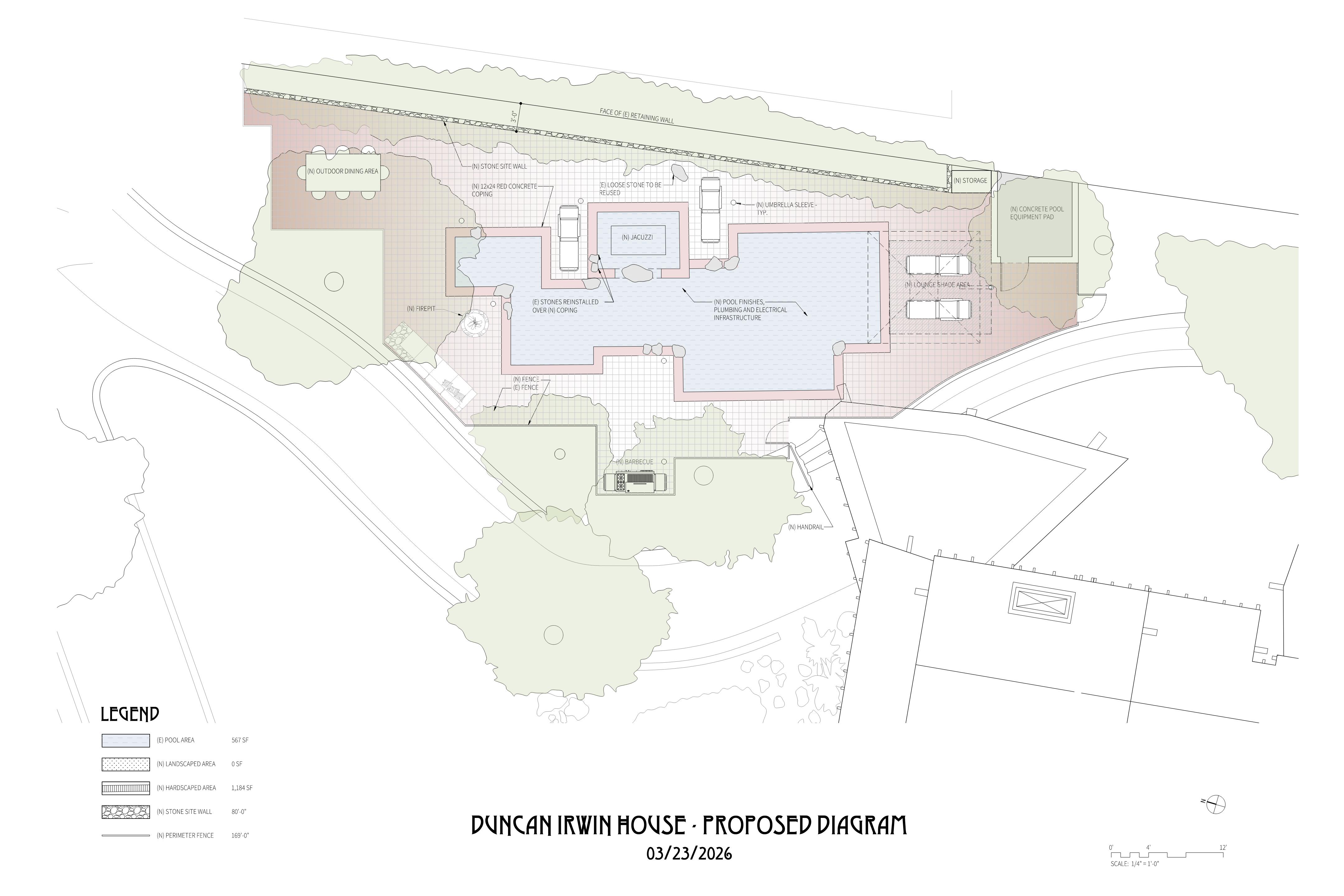 watercolor site plan aged asphalt driveway mature trees red concrete pavers and pool coping light grey roofing for building and carport in lower right corner