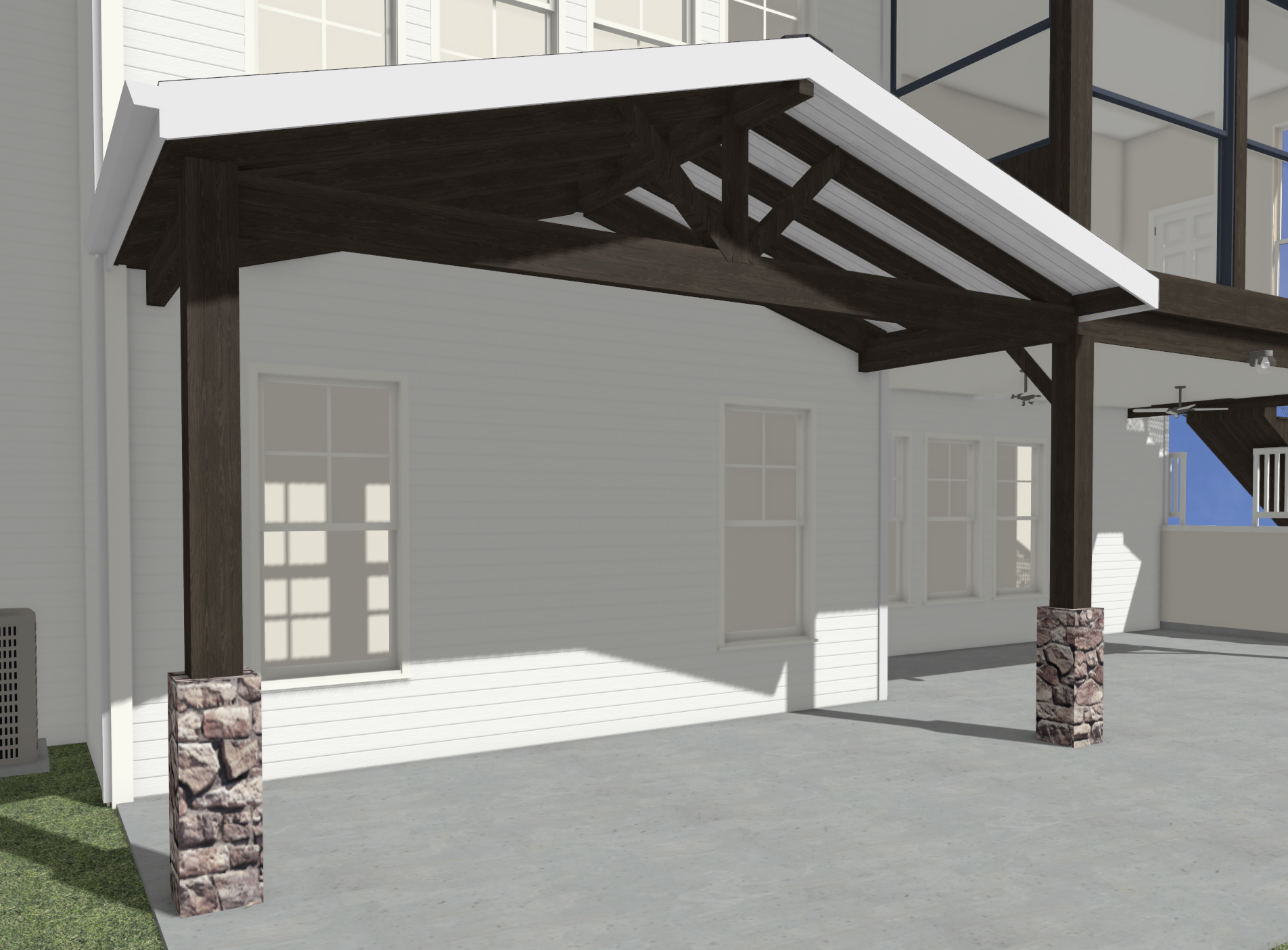 add a table with seating for 8 under the gabled roof the ground is a normal solid concrete slab