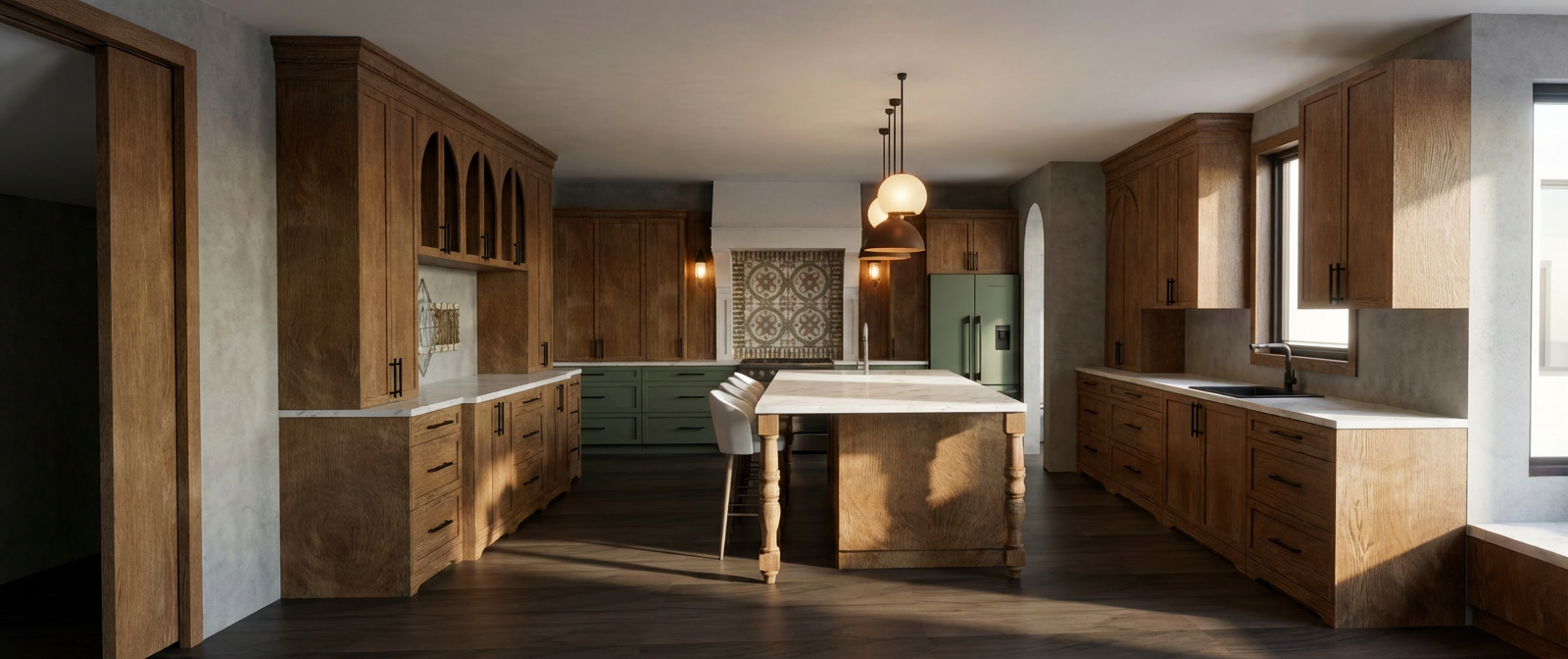 plaintext a spacious modern kitchen with warm inviting atmosphere wooden cabinets in rich oak tones a large white marble island with intricate walnut legs soft green accents on lower cabinetry and refrigerator for contrast polished dark hardwood floor adding depth textured gray walls with subtle earthy undertones ceiling lights copper fixtures with soft white spherical bulbs creating a gentle ambient glow sunlight streaming through large windows enhancing the natural wood textures and casting soft shadows a harmonious blend of rustic charm and modern elegance