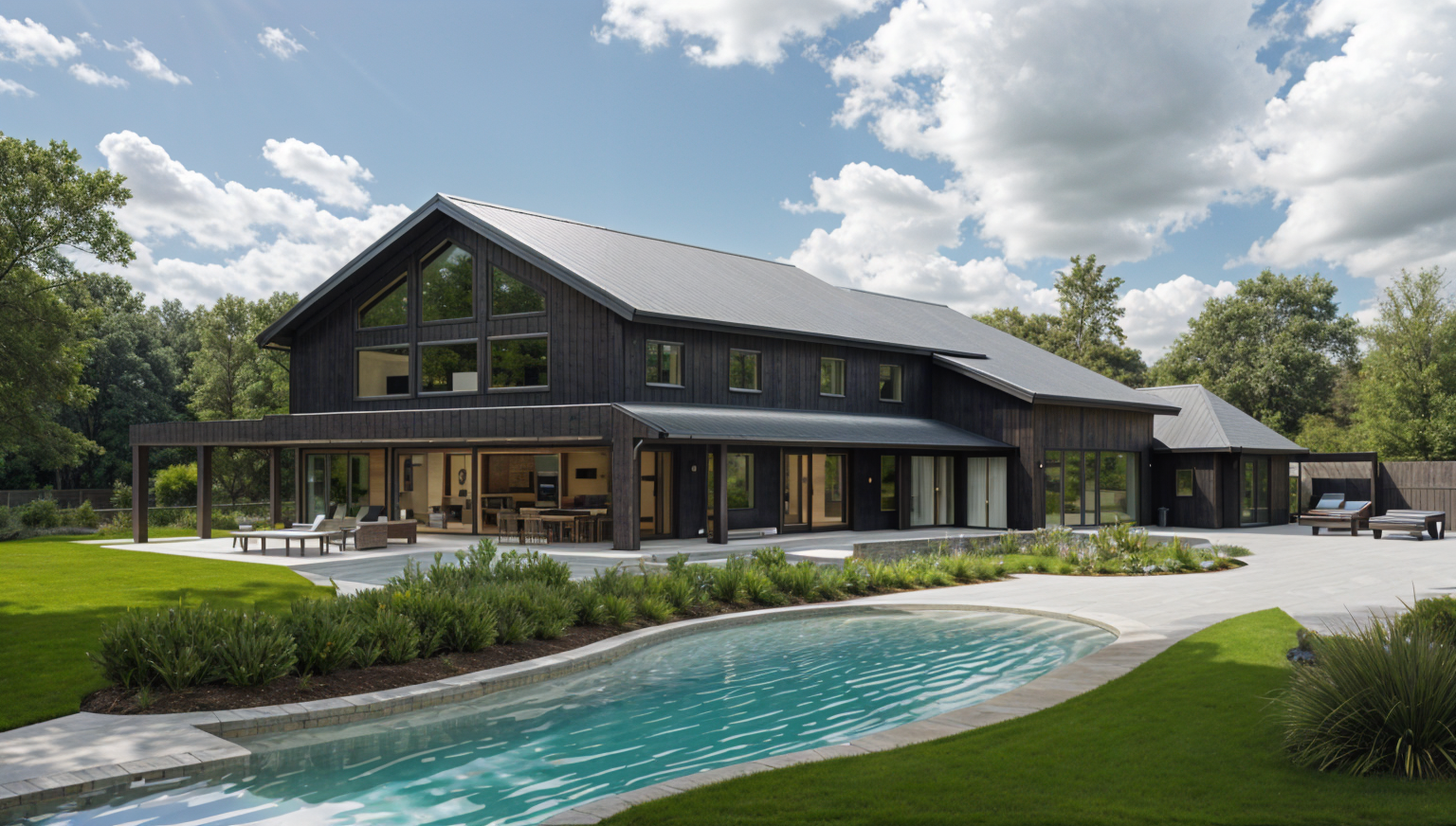trees and bushes on the perimeter few small house on the background early afternoon lights clear suuny sky with some clouds light gray color on the wood parts of the roof dark gray color on the gutter and columns white plaster on the walls white doors more lights