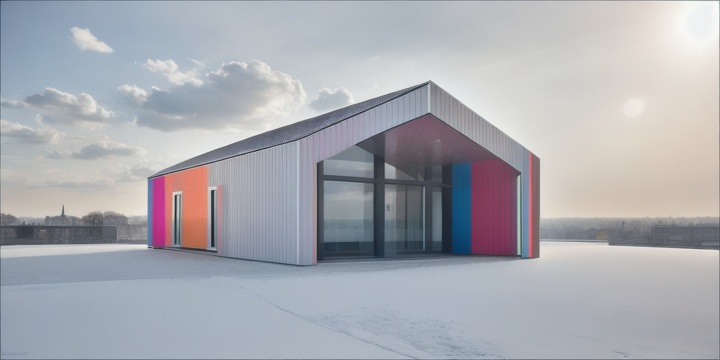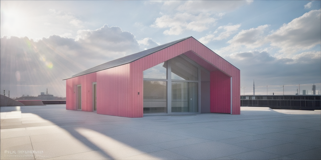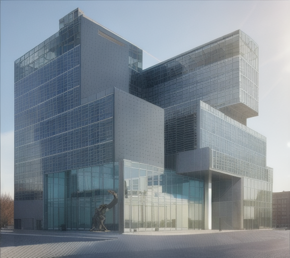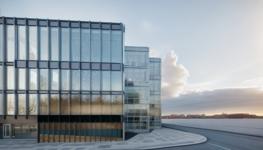 sustainable design exterior shot add trees and grass next to the building on the left add a street next to the building on the right architecture