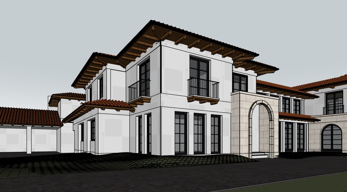 modern spanish style house white stucco walls limestone accent wall wood eaves mediterranean landscaping