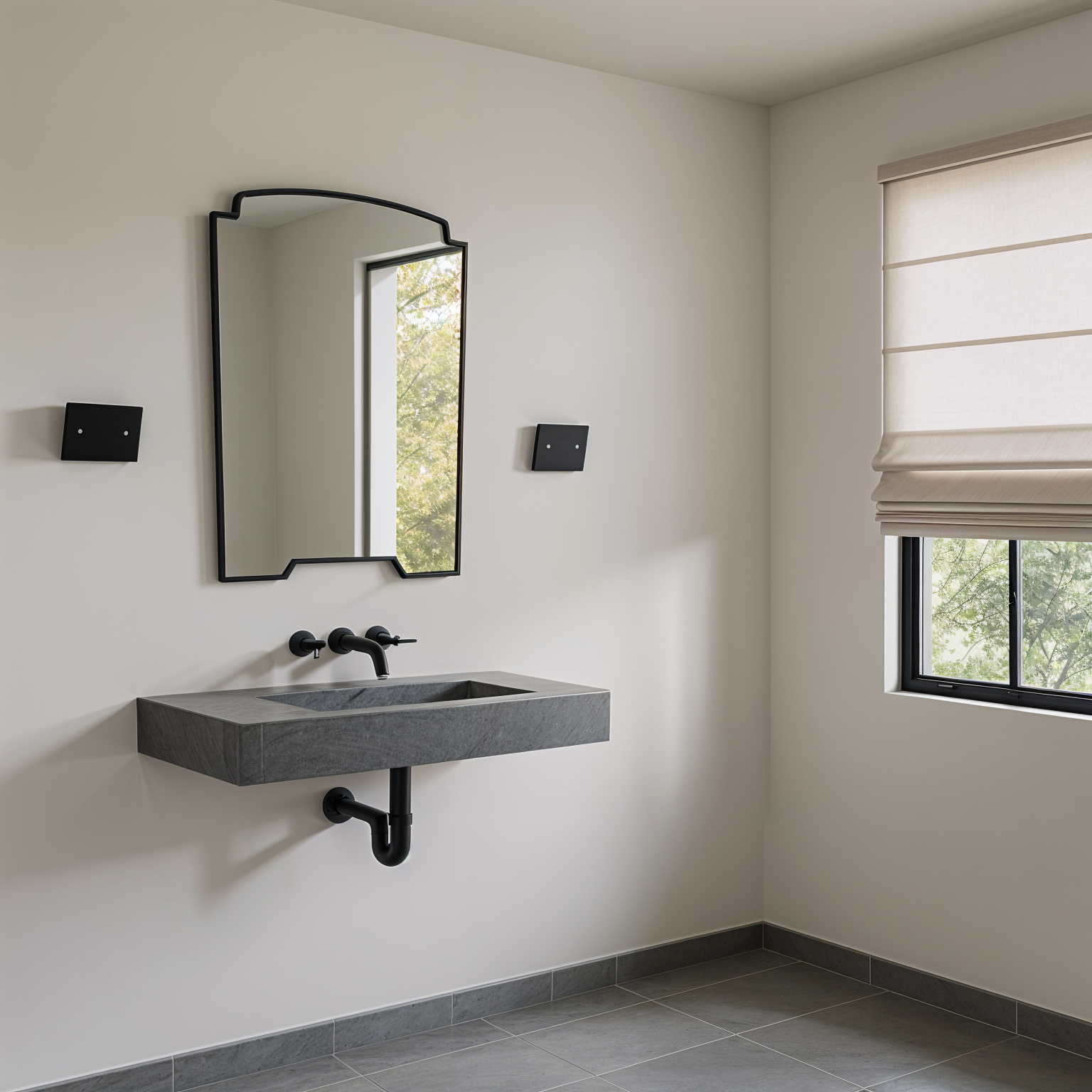 render a charming modern side of a farmhouse with crisp white siding and dark gray shingles the chimney features rustic light stone brick highlight the lush green lawn and vibrant pink flowers in the garden the atmosphere is serene and welcoming under a bright blue sky with soft shadows enhancing the elegant architectural details