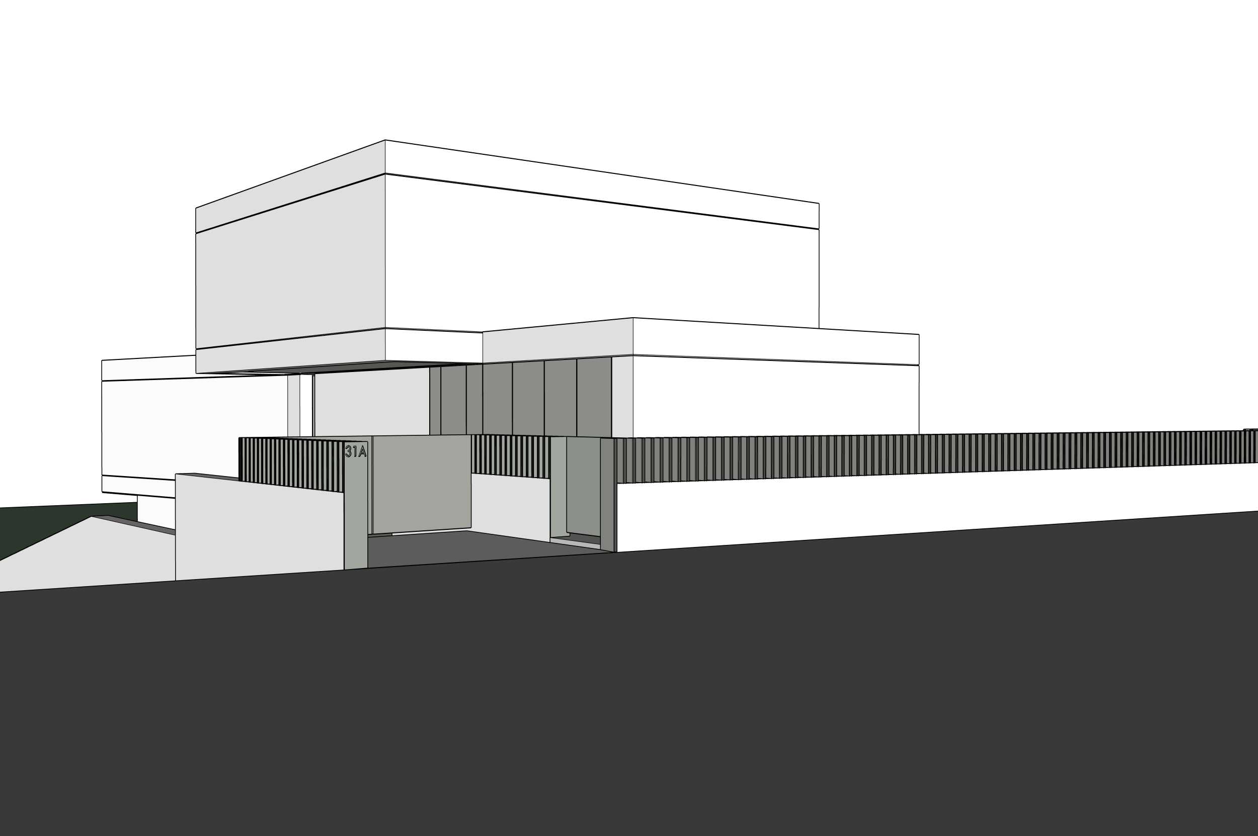 modern minimalist architecture angular geometric structure concrete texture smooth surfaces white tones for the building sky of light blue tranquil atmosphere subtle contrast concrete wall and stainless steel fence small concrete pathway against the concrete wall fence in front floor street and parking against the pathway