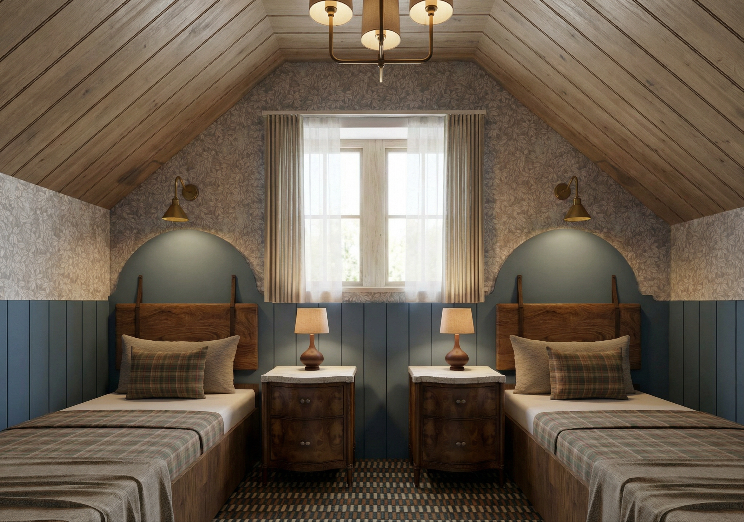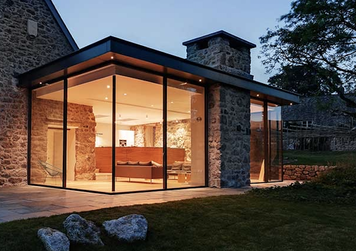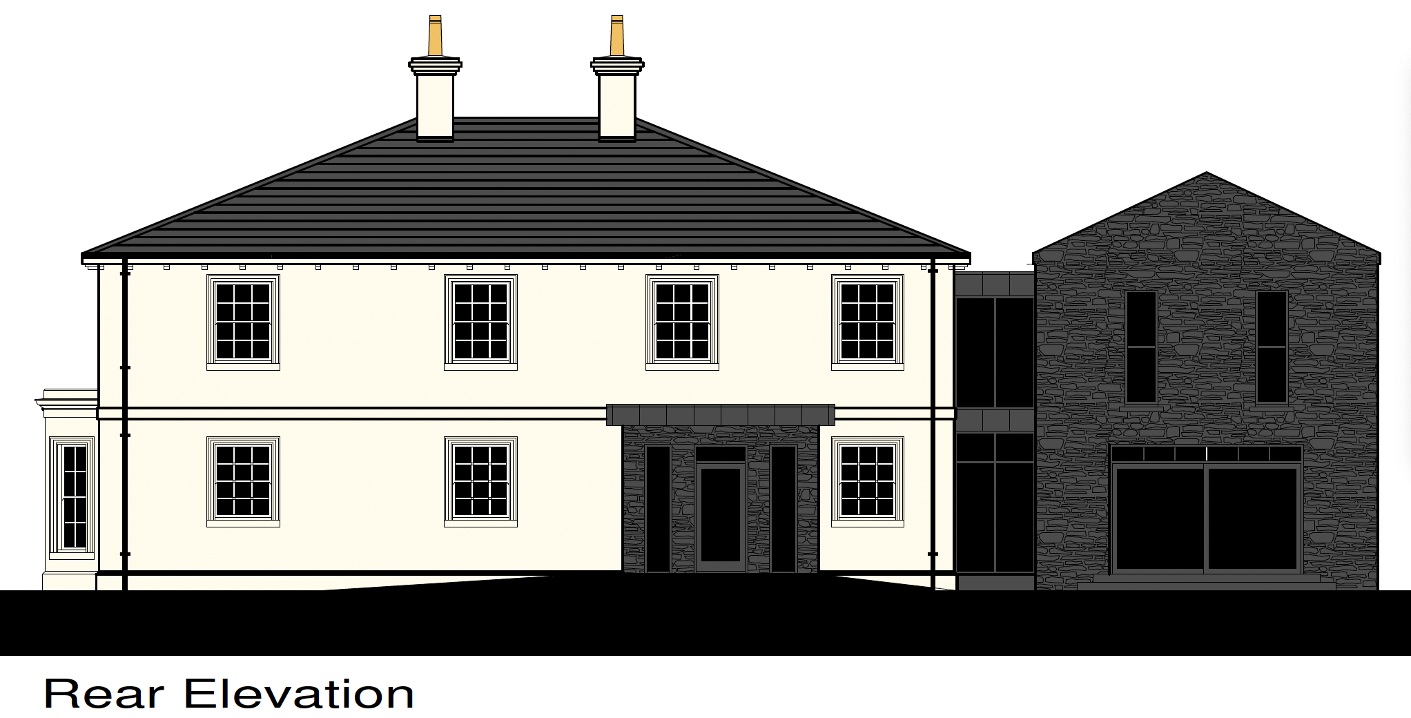 exterior shot a stately elegant two story house with a vintage charm featuring a creamy off white exterior and classic windows with dark frames the roof is a sophisticated slate gray while the chimneys are adorned with a subtle golden hue at the top the side extension is crafted from textured rustic dark gray stone creating an alluring contrast with large sleek windows suggesting a modern touch capture the house in a serene late afternoon ambiance with soft warm lighting that enhances its grandeur the atmosphere exudes a sense of tranquility and timeless elegance