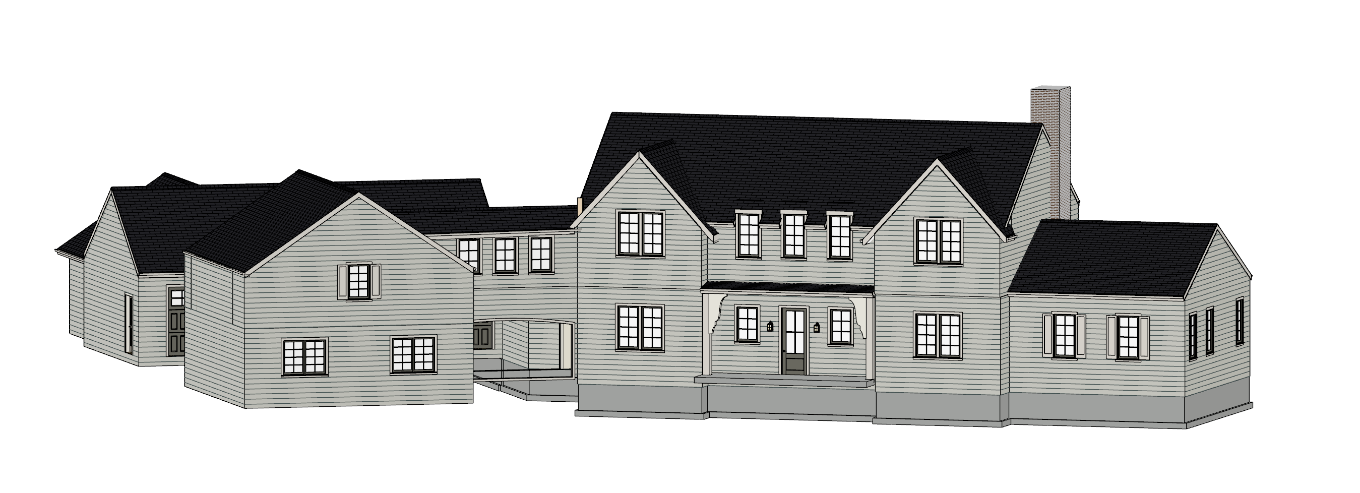 exterior shot photorealistic rendering of a modern farmhouse with soft cream siding black windows charcoal colored roof oak wood front door oak wood timber corbels keep the size layout scale and structure place in a wooded landscape
