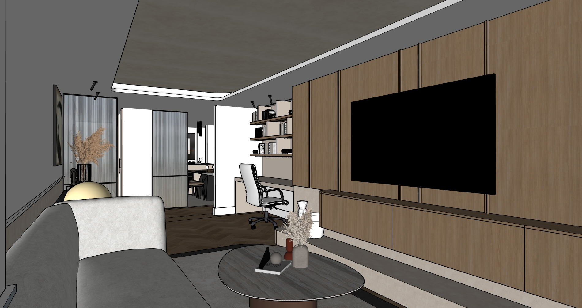 crea una imagen fotorealista a partir de esta de sketchup realza las texturas e iluminacion para que queda todo natural y realista a ade ilimunacion en el foseado del techo no tantas luces y sombras