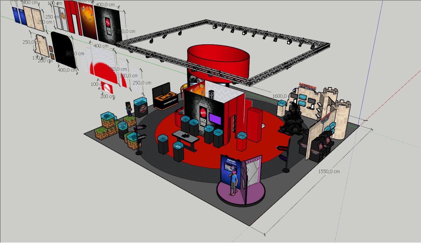 trade fair exhibition hall large industrial pavilion with high ceiling overhead truss lighting system led spotlights busy fair atmosphere with visitors in background other stands visible in distance concrete floor with booth carpet realistic photography style natural and artificial mixed lighting sharp details photorealistic render 35mm lens depth of field