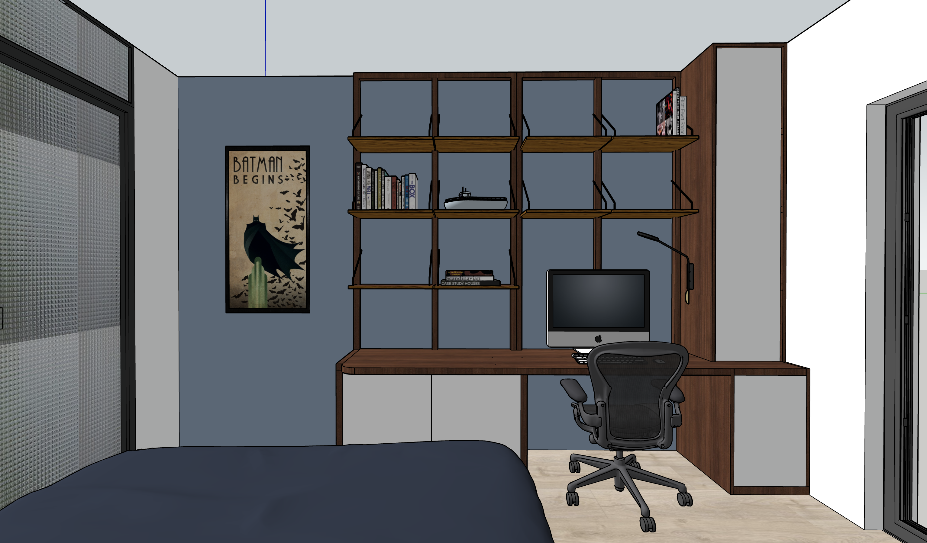 put light in the lighting fixtures luminus room add a few books and decor on the shelves it is a teen boys room put oak wood instead of wallnut
