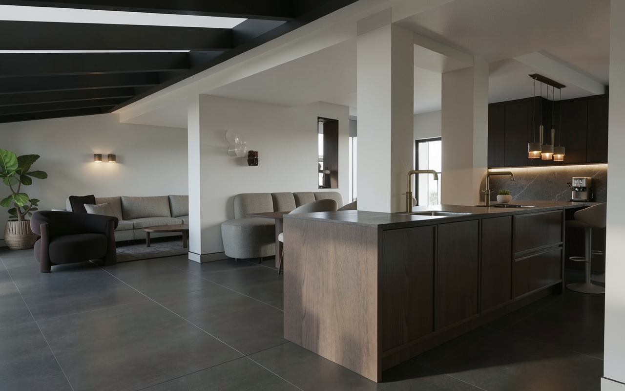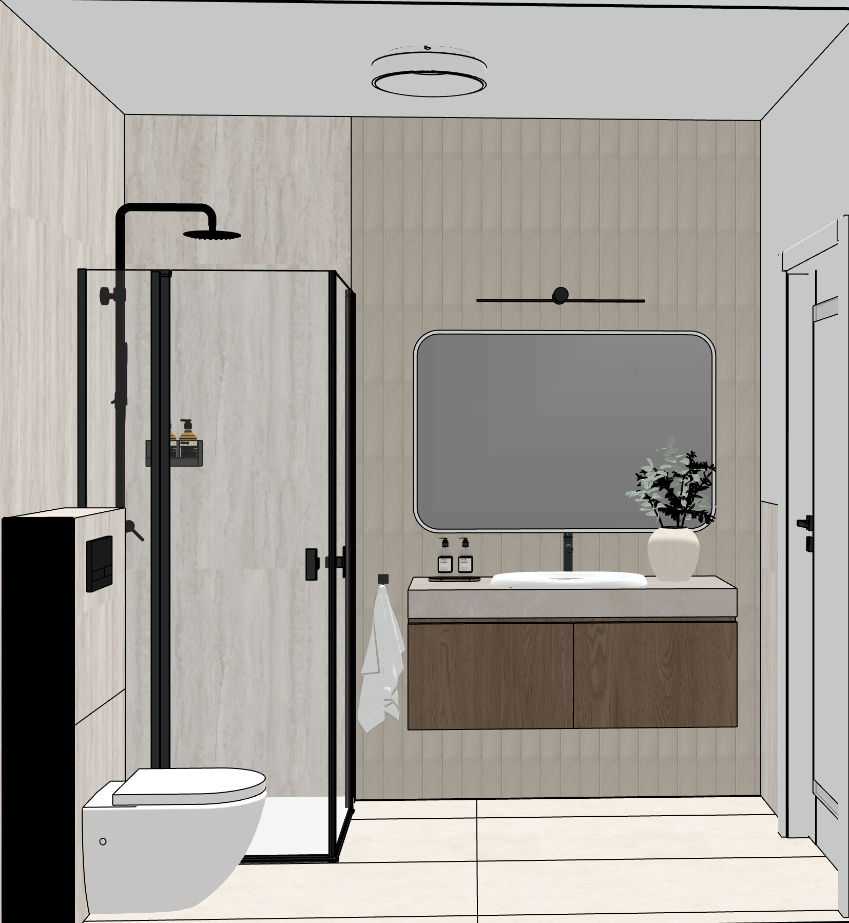 photorealistic bathroom interior visualization in warm beige tones behind the sink use glossy beige wall tiles in a 6x30 cm format as an elegant decorative feature on the remaining walls use large travertine tiles in a 60x120 cm format creating a calm natural and luxurious look include a modern mirror with an led illuminated frame the bathroom should feel warm refined and inviting with soft lighting realistic materials subtle reflections premium finishes and a high end architectural visualization style ultra detailed realistic textures natural proportions photorealistic render
