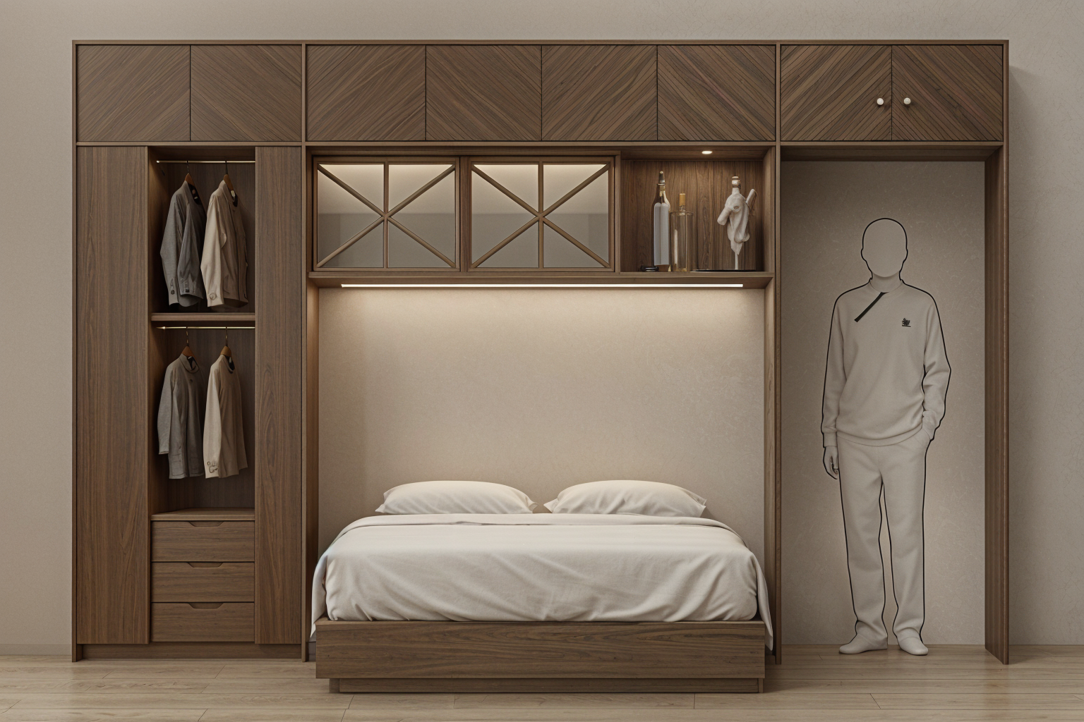 interior shot light wood bed surround with overhead cabinets at the hallway where the person is standing soft lighting inside the glass cabinets over the bed modern finishes and clean lines